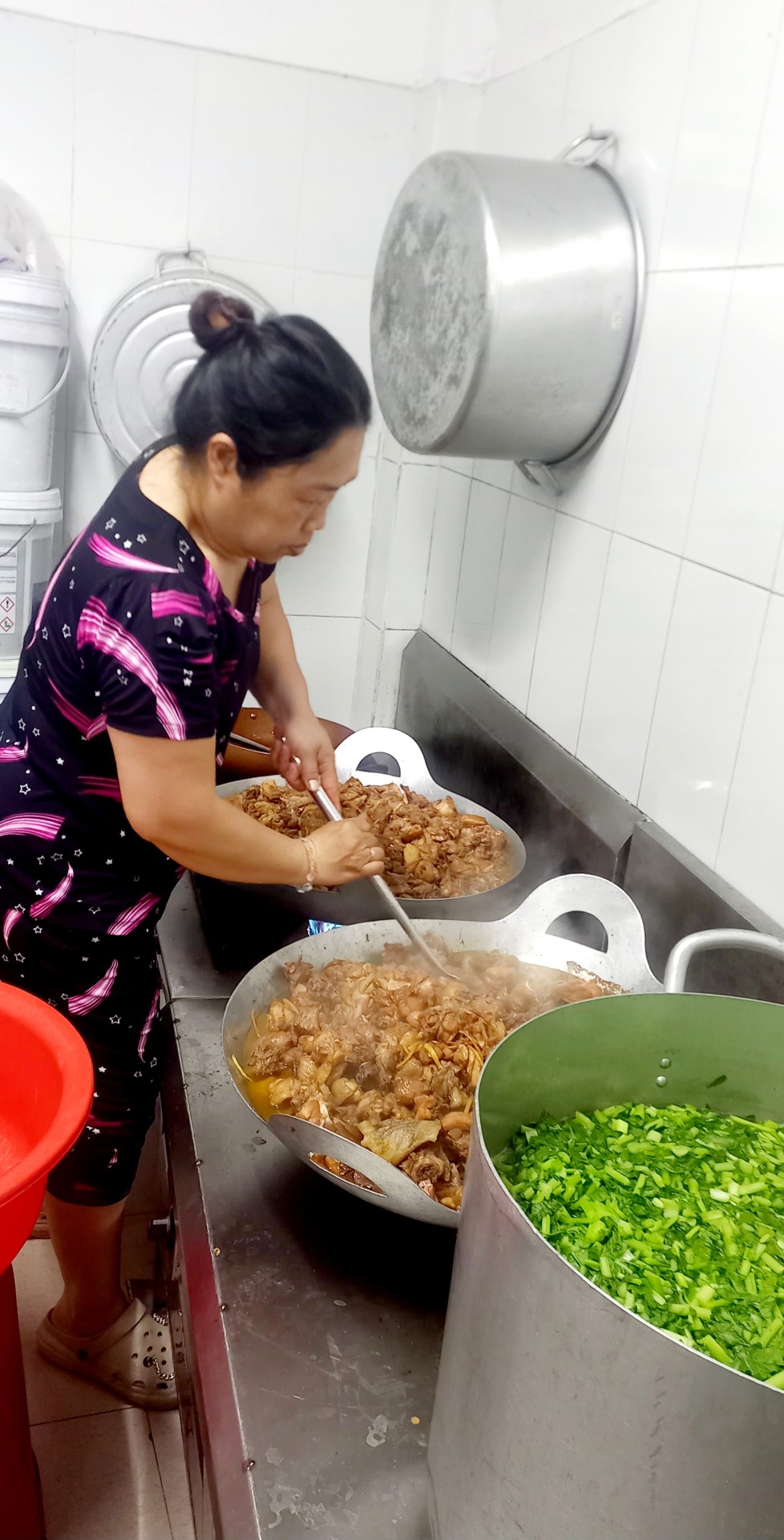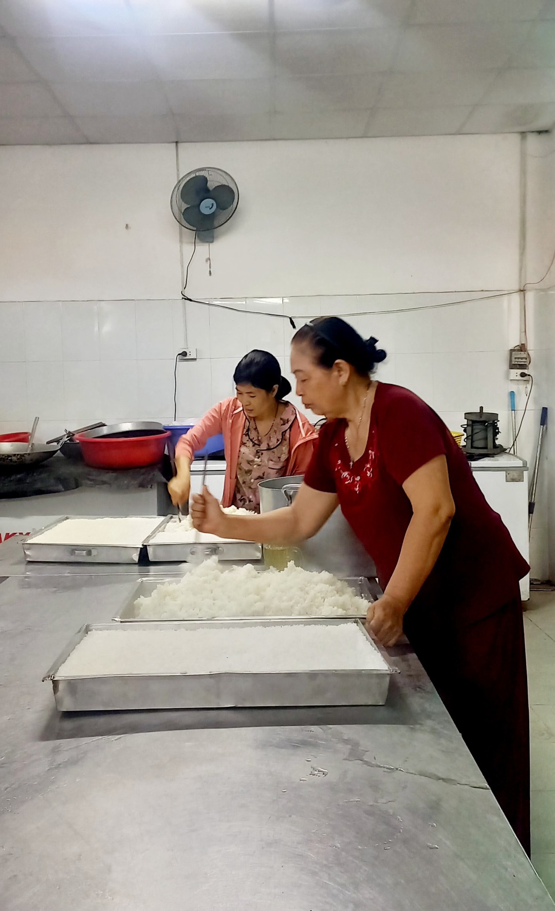 Ngay từ sớm, một số chị em đã có mặt để nhặt rau, sơ chế thực phẩm, nấu cơm. Đến 6g, chị Maria Hoàng Thị Phương Oanh bắt đầu chế biến các món chính. Mỗi người một việc, tất cả đều chung một niềm vui khi được góp phần vào công việc bác ái. Chị Maria Nguyễn Thị Tươi chia sẻ rằng ai cũng cảm thấy hạnh phúc khi được phục vụ người nghèo bằng chính công sức của mình.