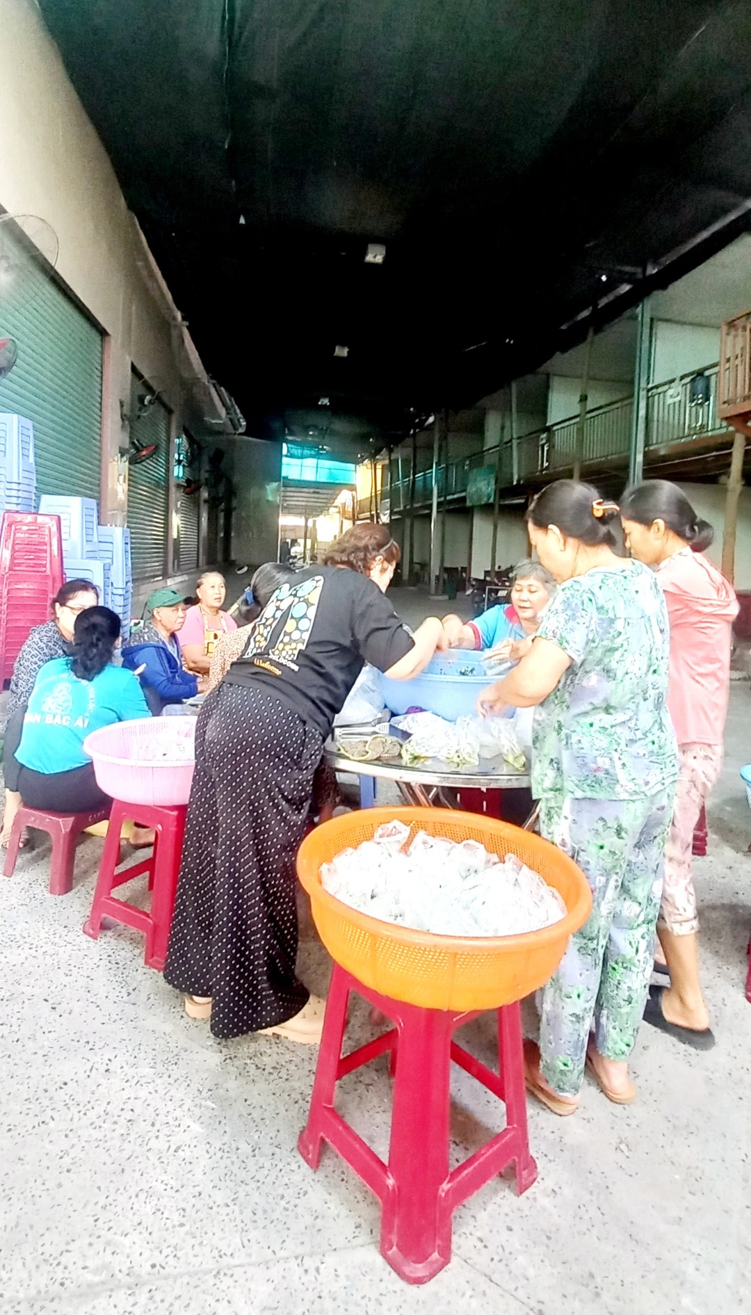 Để có được những phần cơm trao đi, vào mỗi Chúa nhật hằng tuần, ban ve chai Caritas âm thầm thu gom phế liệu, cùng với sự chung tay của cộng đoàn: người góp rau, người cho gà, cá… Tất cả tạo nên nguồn thực phẩm nghĩa tình.