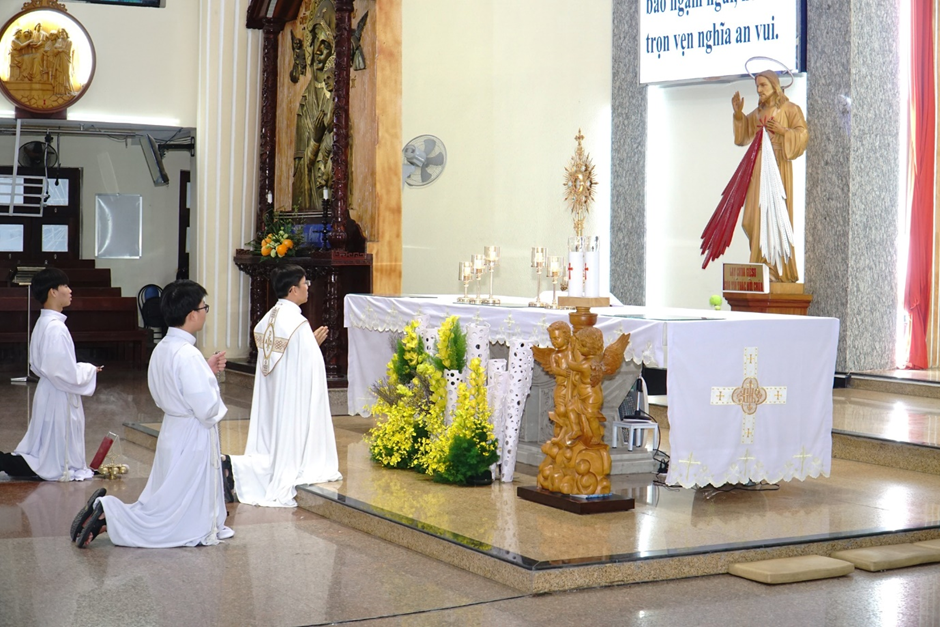 Sau cùng, cộng đoàn bước vào giờ Chầu Thánh Thể cầu nguyện cho sứ vụ thừa sai. Cha phó giáo xứ Thạch Đà đã xông hương và đặt Mình Thánh Chúa cách trọng thể.