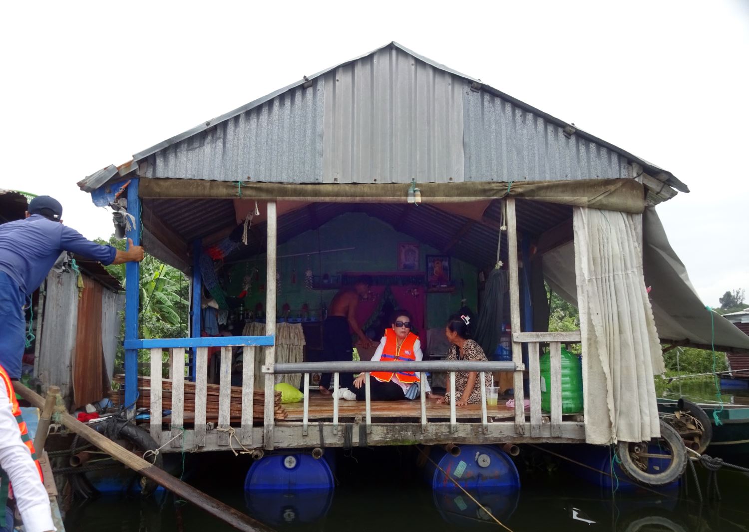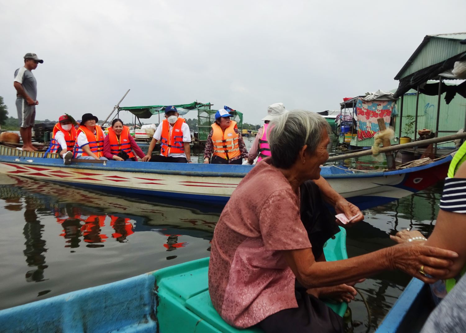 Đoàn tiếp tục phát quà đến các làng bè, vận chuyển bằng thuyền đến từng gia đình. Nhiều hộ là Việt Kiều Campuchia hồi hương, cuộc sống còn nhiều khó khăn khiến các thành viên đoàn xúc động. Mọi người dùng cơm trưa tại giáo điểm lúc 12g15.