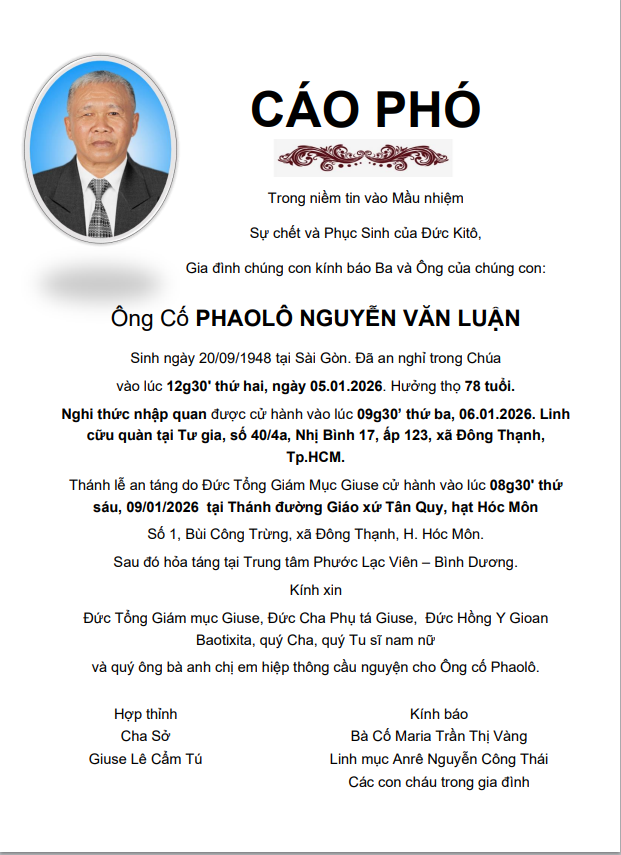 Cáo phó: Thân phụ của Lm Anrê Nguyễn Công Thái