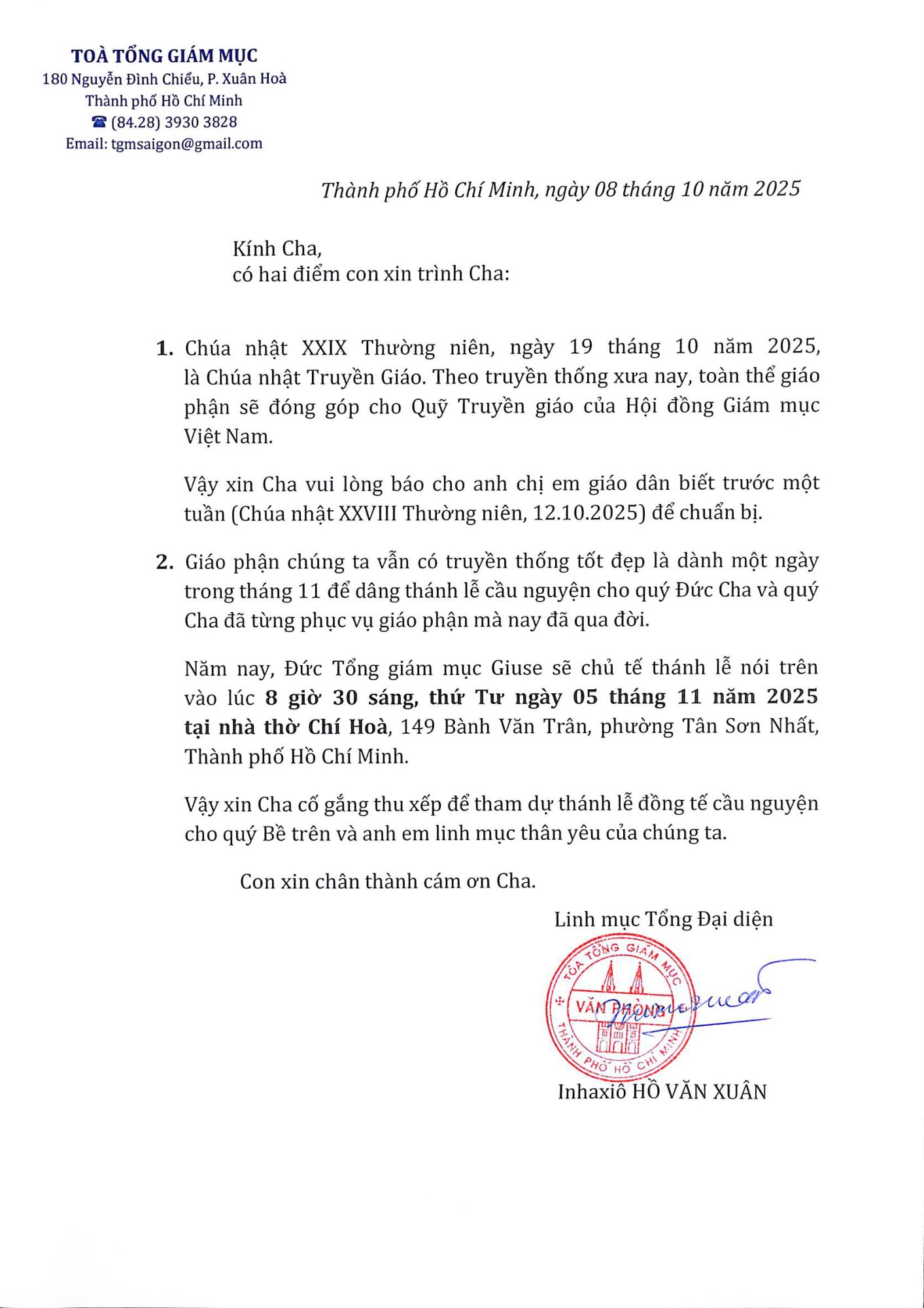 Văn phòng chuyển tới quý Cha thư của Cha Tổng Đại diện Inhaxiô (trong tập tin đính kèm) về việc lạc quyên cho Quỹ Truyền giáo của Hội đồng Giám mục Việt Nam vào Chúa nhật Truyền giáo (19.10.2025) cũng như Thánh lễ cầu nguyện cho quý Đức Cha và quý Cha trong Tổng giáo phận Sài Gòn đã qua đời (05.11.2025).