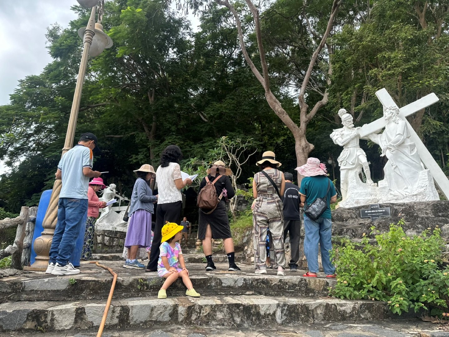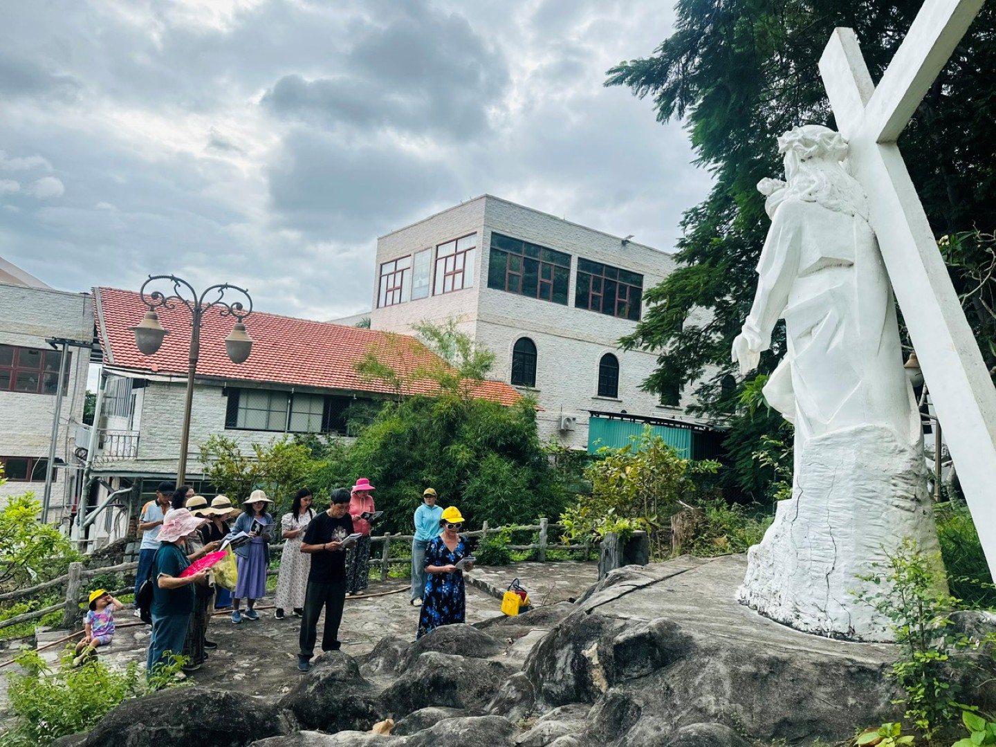 Vào 15g00, đoàn cùng nhau suy niệm 14 chặng Đàng Thánh Giá, bước theo Chúa Giêsu trong hành trình thương khó: