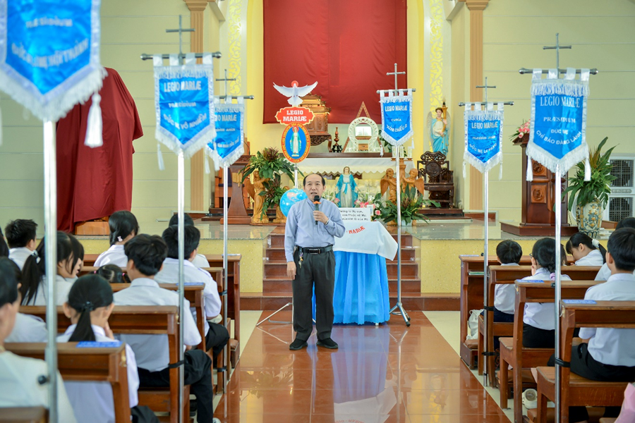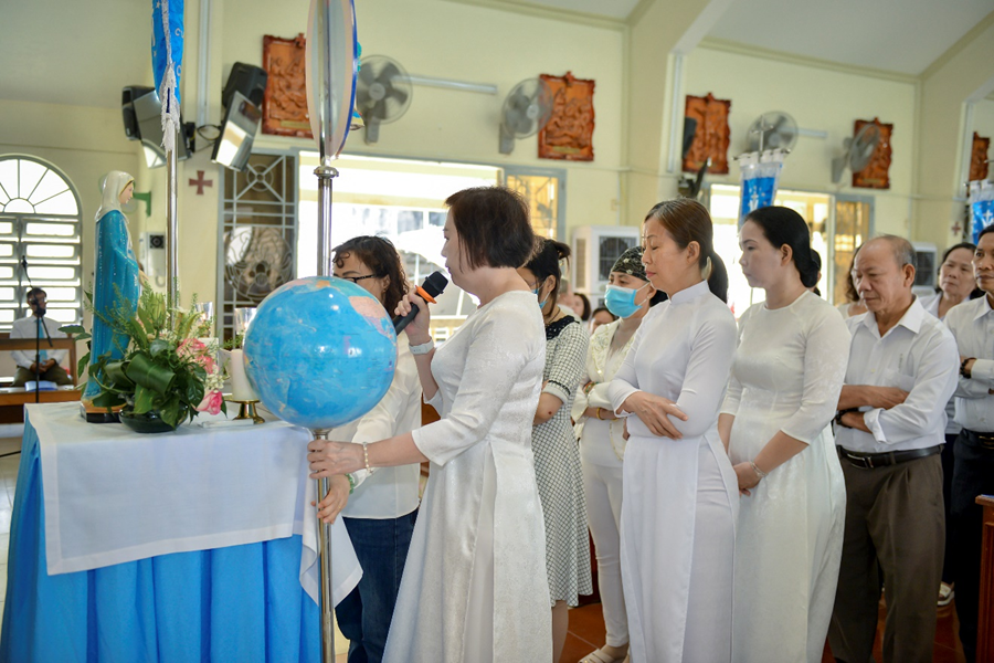 Một nội dung quan trọng của buổi họp mặt là nghi thức dâng mình cho Đức Mẹ. Trong bầu khí trang nghiêm và xúc động, từng hội viên lần lượt tiến lên trước bàn thờ, dâng lời tận hiến: “Lạy Nữ Vương là Mẹ con, toàn thân con thuộc về Mẹ, và mọi sự của con là của Mẹ”. Đây không chỉ là một nghi thức truyền thống của Legio Mariae, mà còn là lời cam kết sống đức tin cách mạnh mẽ hơn, yêu mến Mẹ nhiều hơn và sẵn sàng trở nên khí cụ của Mẹ trong công cuộc loan báo Tin Mừng.
