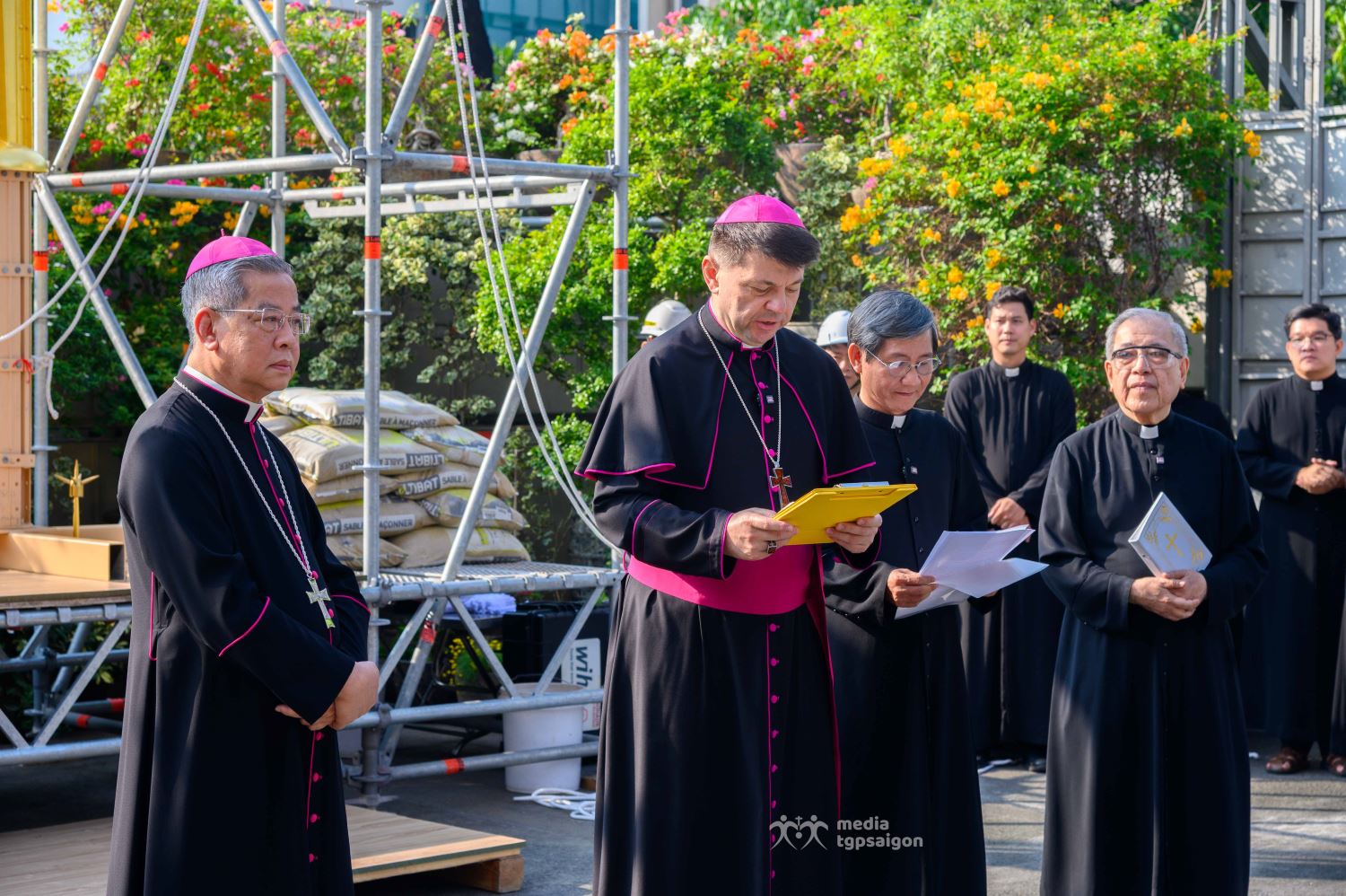 Trước khi hai Thánh giá được đưa lên đỉnh tháp kẽm Nhà thờ Chính tòa Đức Bà Sài Gòn, Đức Tổng Giám mục Marek Zalewski đã có bài diễn từ.
