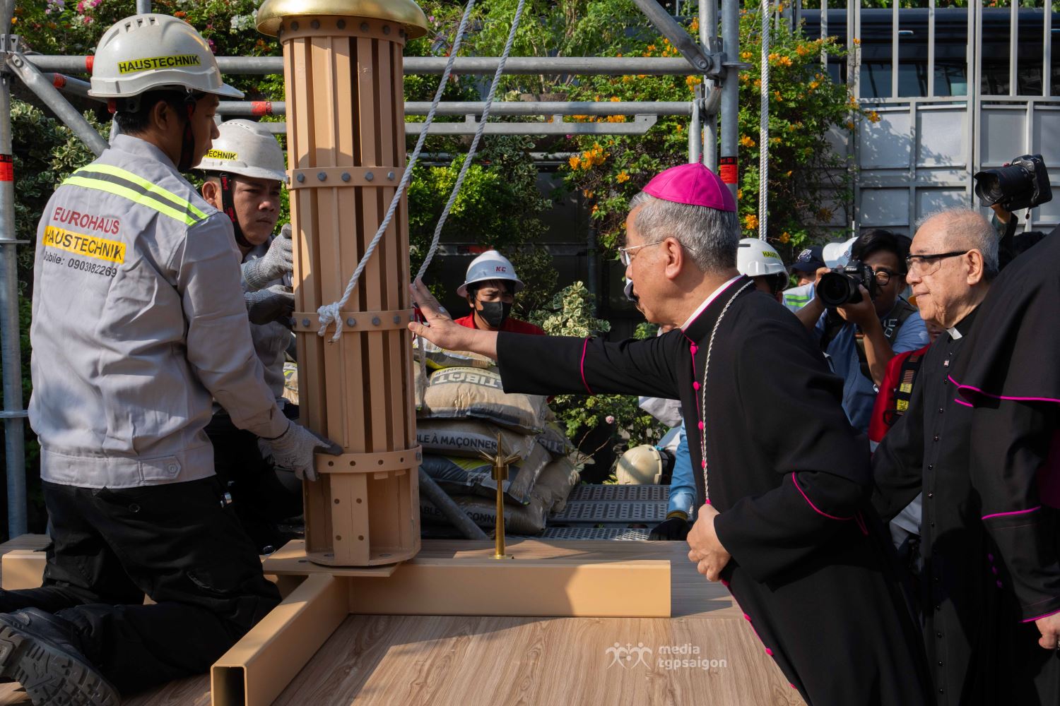 Sau phần phát biểu của Đức Tổng Giám mục Marek Zalewski, Thánh giá đầu tiên được đưa lên đỉnh tháp phía trường học. Trước khi nâng, Đức Tổng Giám mục Marek Zalewski, Đức Tổng Giám mục Giuse Nguyễn Năng cùng linh mục Tổng Đại diện Inhaxiô đã thực hiện cử chỉ chạm tay vào Thánh giá. Xe cẩu chuyên dụng sau đó từ từ nâng Thánh giá lên độ cao 57 mét.