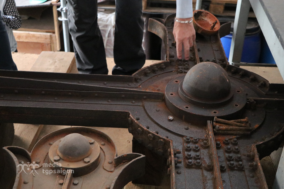 Các mẫu vật liệu nguyên bản, đặc biệt là thép, kẽm, rivet, bulong, vữa vôi cổ, được đưa đi phân tích nhằm phục dựng loại vật liệu tương thích. Đồng thời, hệ khung đỡ tạm thời được lắp đặt để bảo đảm ổn định kết cấu trong quá trình tháo dỡ và thay thế các chi tiết.