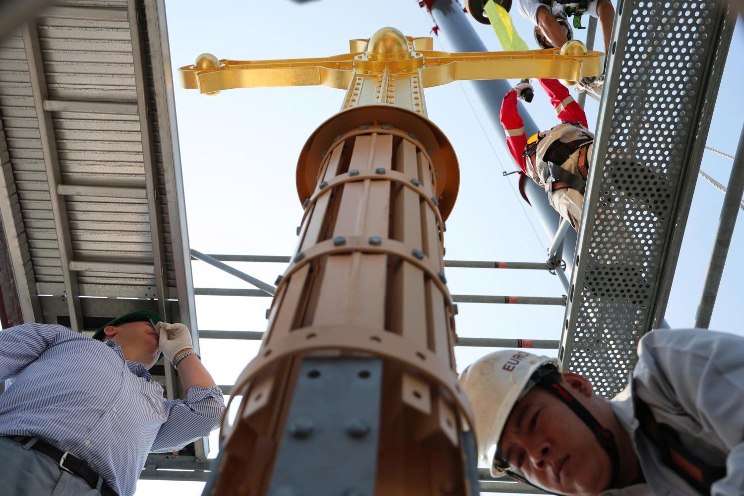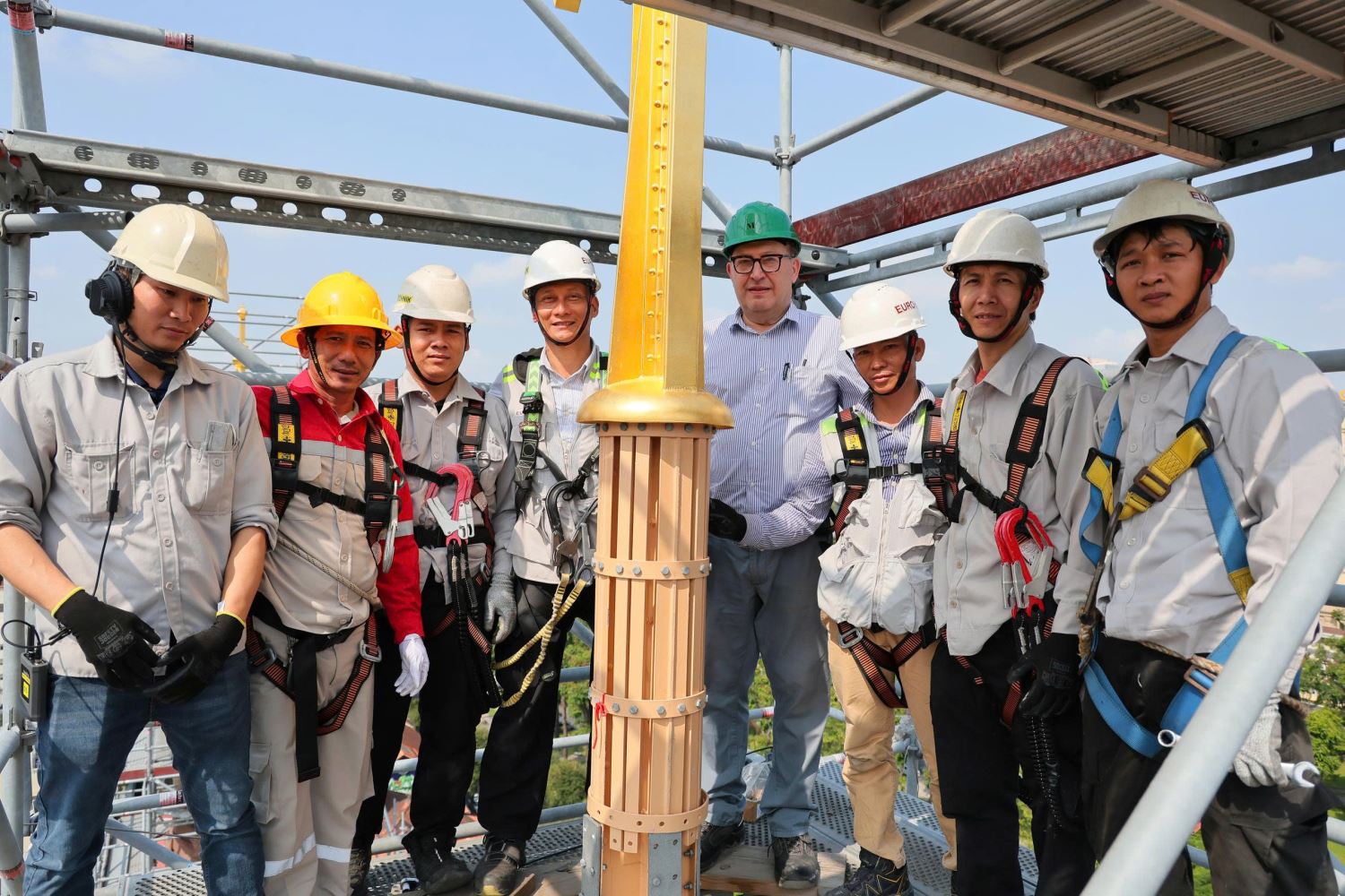 Dưới sự điều phối, tham gia trực tiếp của các chuyên gia Bỉ, đội ngũ thi công tiến hành căn chỉnh vị trí, lắp đặt chân đế và siết chặt hệ thống bulông liên kết vào kết cấu thép đỉnh tháp. Các thao tác được thực hiện từng bước theo trình tự, bảo đảm độ chính xác.