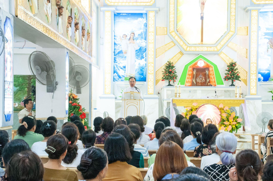 Từ 8g00, cộng đoàn giáo dân đã quy tụ tại khuôn viên Đền Thánh để lần chuỗi Mân Côi trong bầu khí sốt sắng và trang nghiêm. Sau đó, cộng đoàn lắng nghe sơ Anna chia sẻ đề tài “Linh đạo Dòng Mến Thánh Giá”, với những suy tư sâu sắc về đời sống và căn tính của người nữ tu Mến Thánh Giá. Theo linh đạo của Hội Dòng, Đức Giêsu Kitô chịu đóng đinh chính là “đối tượng duy nhất của lòng trí”, là trung tâm và cùng đích của toàn bộ đời sống thánh hiến.