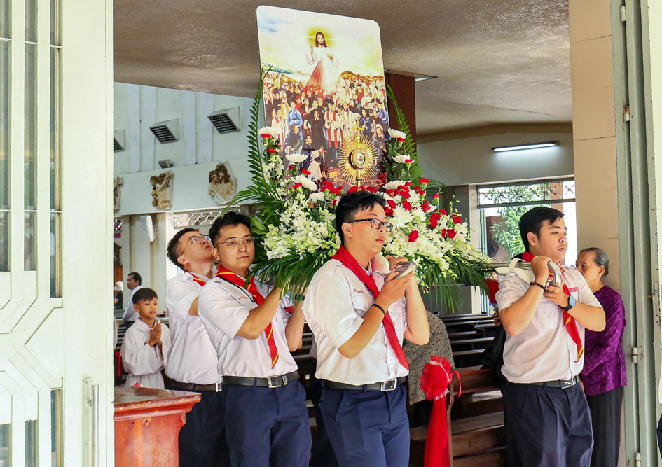 Trước Thánh lễ, các em thiếu nhi long trọng cung nghinh linh ảnh và thánh tích của các Thánh Tử Đạo Việt Nam.