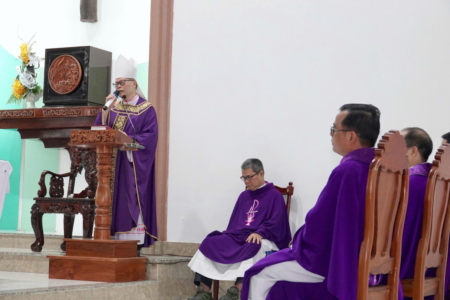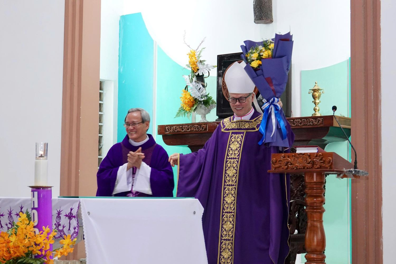 Sau lời nguyện hiệp lễ, ông Chủ tịch Hội đồng Mục vụ thay mặt cộng đoàn bày tỏ lòng biết ơn tới Đức Giám mục Giuse và các linh mục, đồng thời dâng lên Ngài bó hoa tươi thắm cùng một món quà nhỏ.