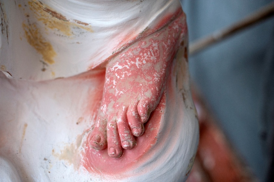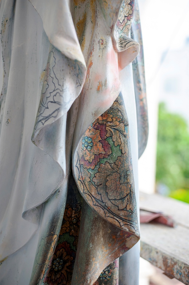 Phục chế tượng không đơn thuần là sơn lại cho mới, nhất là những pho tượng cổ! Đó là một quá trình đòi hỏi sự cần mẫn và đôi bàn tay cực kỳ khéo léo. Mỗi lớp sơn cũ bong tróc phải được xử lý tỉ mỉ, mỗi vết nứt phải được trám vá bằng sự thấu hiểu về chất liệu. Nhìn cái cách các bạn trẻ chăm chú vào từng khóe mắt, bờ môi của tượng, người ta cảm nhận được đó không chỉ là công việc mưu sinh, mà là một công việc nghệ thuật đầy tràn sự tận hiến.