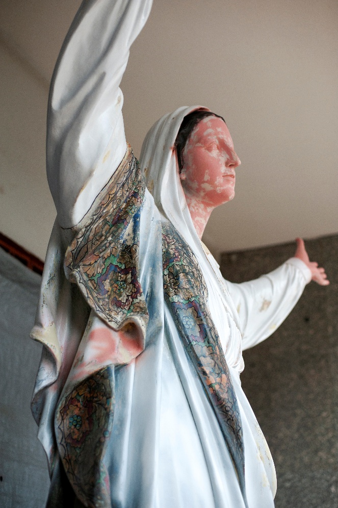 Trải qua rất nhiều năm được đặt cố định trên ban công trước tiền sảnh nhà thờ, tượng Đức Mẹ đã phai dần theo thời gian. Những lớp sơn phủ trước đây, đã làm khuất lấp những chi tiết nguyên bản của pho tượng. Và cũng rất may mắn, chính các lớp sơn phủ này đã bảo vệ nguyên vẹn các họa tiết nguyên bản của pho tượng cổ. Các em đã giúp đại diện Ban Mục vụ Truyền thông giáo xứ leo lên dàn giáo, chui qua một lỗ thông gió bước ra ban-công cao, nơi đặt tượng Đức Mẹ mà nhiều năm hiếm có ai chạm đến, để xác định xuất xứ, nguồn gốc và đánh giá hiện trạng.