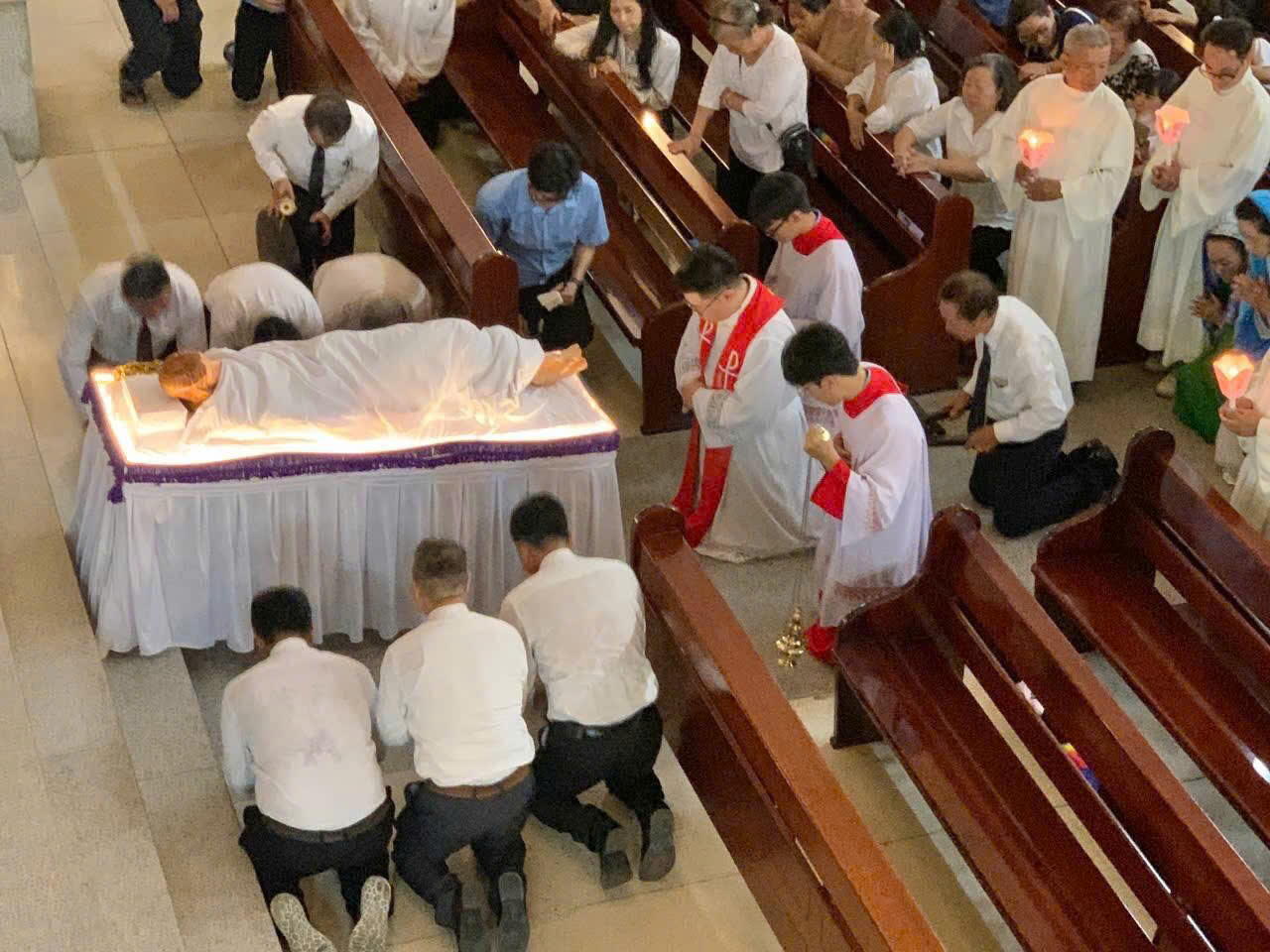 Mở đầu nghi thức trong bầu khí thinh lặng, linh mục chủ sự tiến ra cung thánh trong phẩm phục màu đỏ và phủ phục trước bàn thờ; cộng đoàn quỳ gối hiệp ý cầu nguyện. Bầu khí trang nghiêm giúp mọi người bước vào chiều sâu mầu nhiệm cứu độ.