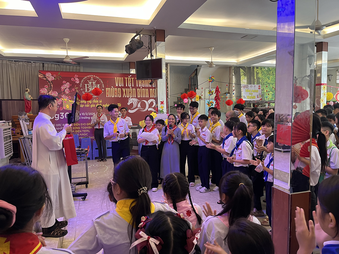 TGPSG -- Vào lúc 07g30 sáng Chúa nhật, ngày 08.02.2026, Thánh lễ Tạ ơn mừng đón Xuân Bính Ngọ 2026, với chủ đề “Vui cùng Chúa Xuân”, dành cho các em Thiếu nhi Thánh Thể (TNTT) và các anh chị Giáo lý viên, được cử hành tại nhà thờ giáo xứ Bình Minh, do linh mục Quản xứ Gioan Baotixita Lê Quốc Đạt chủ tế.