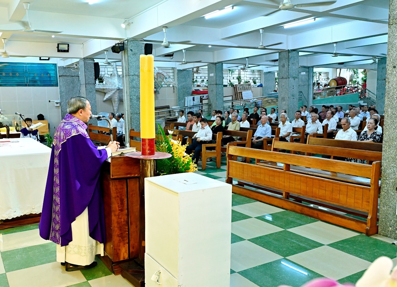 Thánh lễ trọng thể do cha Phêrô Nguyễn Ngọc Vượng chủ tế. Hiện diện trong Thánh lễ có Đức Tổng Giám mục Phaolô Bùi Văn Đọc. Đồng tế với ngài có cha Tổng Đại diện, quý cha đồng lớp, và gần 100 cha trong và ngoài Tổng Giáo phận Sài Gòn.