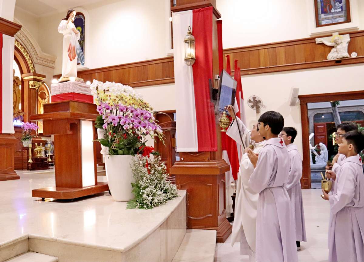 Sau Thánh lễ, xứ đoàn Gia đình Phạt Tạ Thánh Tâm Chúa Giêsu cùng cộng đoàn cử hành giờ kinh, suy niệm Lòng Thương Xót Chúa.
