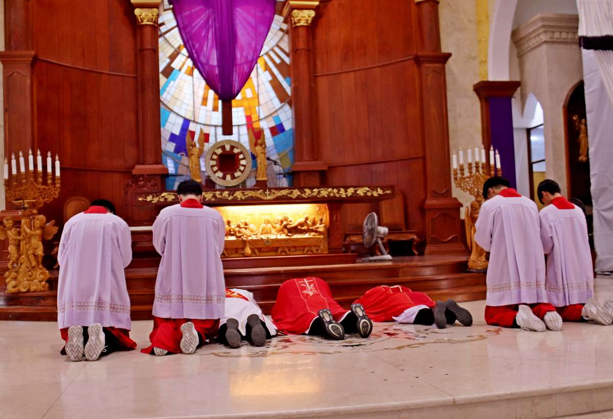 Nghi thức được bắt đầu với đoàn rước từ cuối nhà thờ tiến lên Cung Thánh. Hai Linh mục và Thầy Phó tế phủ phục trước bàn thờ.