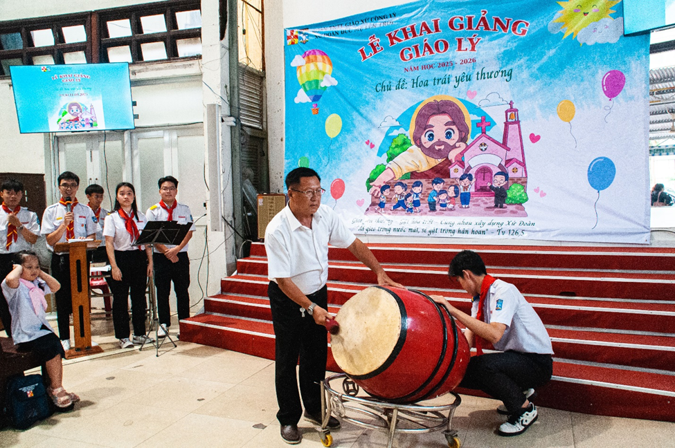 Ông Chủ tịch Hội đồng Mục vụ giáo xứ đánh trống khai giảng năm học giáo lý 2025-2026.