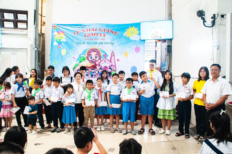 Trong ngày khai giảng, Ban Caritas trao học bổng cho các em thiếu nhi có hoàn cảnh khó khăn.