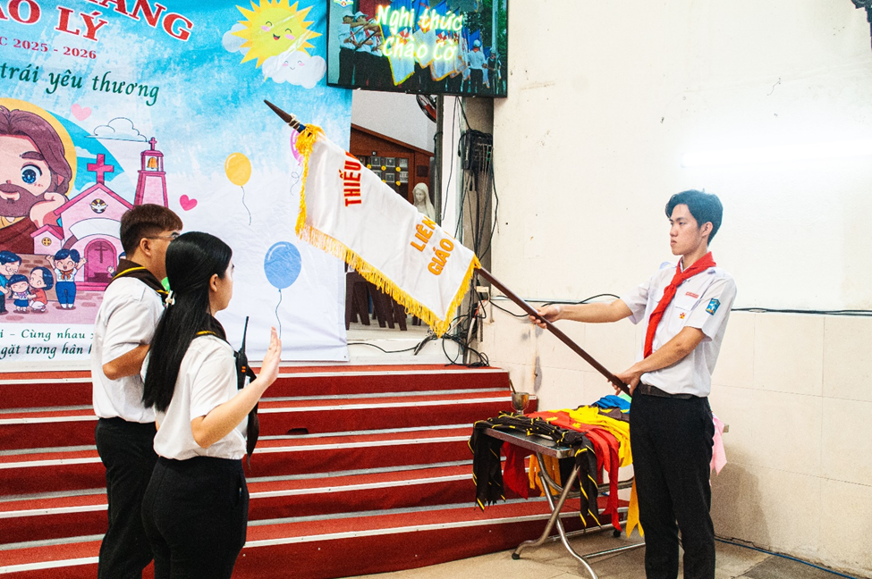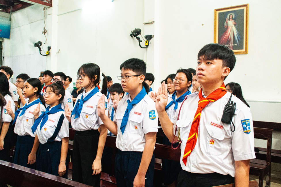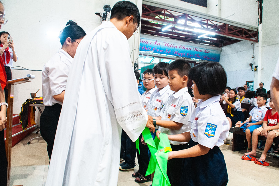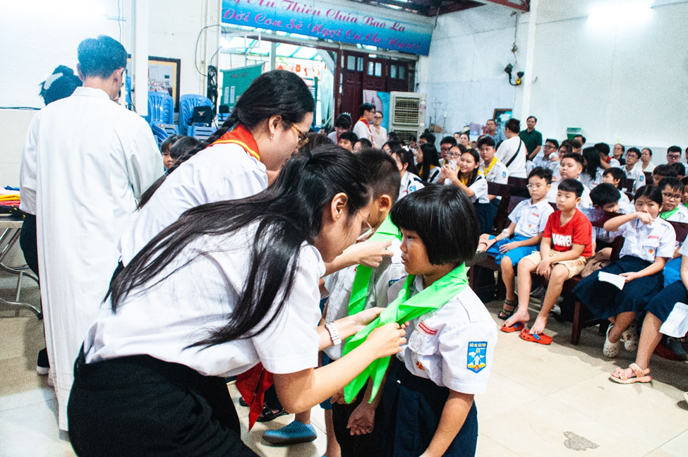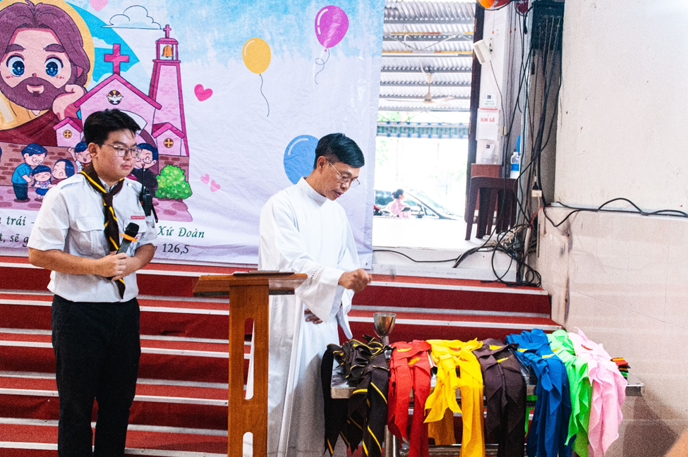 Linh mục Giuse gửi lời nhắn nhủ đến các em và các anh chị huynh trưởng - dự trưởng, làm phép và trao khăn cho các em thiếu nhi; các anh chị huynh trưởng thắt khăn cho các em. Ngài cũng trao khăn cho các tân dự trưởng và chủ sự nghi thức Tuyên hứa Huynh trưởng, đồng thời trao cấp hiệu cho xứ đoàn trưởng.