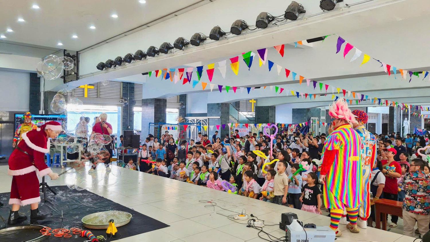Đặc biệt, bầu không khí hội chợ càng thêm rộn rã và náo nhiệt nhờ sự xuất hiện của nhóm Chú hề. Đây là món quà tinh thần đặc biệt do Cha Phó Gioan mời về để dành tặng cho các em. Những tiết mục xiếc vui nhộn cùng những chiếc bong bóng tạo hình nghệ thuật đầy màu sắc đã thực sự trở thành thỏi nam châm thu hút, mang lại những tràng cười sảng khoái cho các bạn nhỏ.