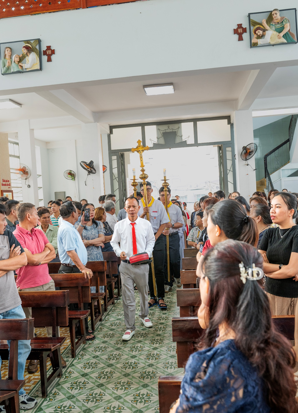 Thánh lễ khởi sự với đoàn rước từ cuối nhà thờ tiến vào cung thánh trong bầu khí trang nghiêm. Dẫn đầu là Thánh giá nến cao, tiếp đến là các em thiếu nhi trong những bộ phẩm phục nhiều màu sắc tượng trưng cho các Hội Dòng trong Giáo Hội, theo sau là các em lễ sinh và cha chủ tế.