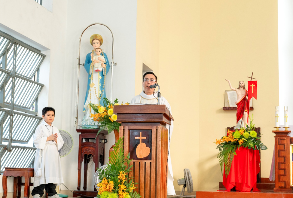 Trong bài giảng, linh mục chủ tế Đaminh chia sẻ về hình ảnh Chúa Giêsu là Mục Tử nhân lành, Đấng biết rõ từng con chiên và luôn yêu thương, chăm sóc đoàn chiên của mình. Ngài quảng diễn: “Như chiên nhận ra tiếng mục tử, mỗi người cũng được mời gọi nhận ra và bước theo tiếng Chúa, vì chính Chúa là ‘Cửa’ dẫn đưa chúng ta vào sự sống.”