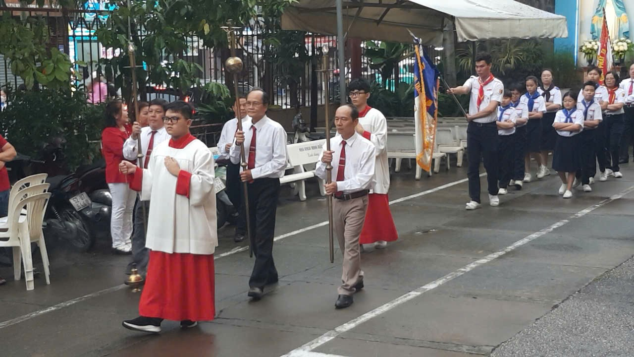 Tiếng trống, tiếng chuông nhà thờ vang vọng mở đầu đoàn rước. Dẫn đầu là Bình hương, Thánh giá nến cao, tiếp đến là Thiếu nhi - những người kế thừa đức tin của cha ông, các thành viên Hội đồng Mục vụ giáo xứ (HĐMV), các hội đoàn, các sơ, kiệu các Thánh Tử đạo, các em lễ sinh, các linh mục và sau cùng là cộng đoàn dân Chúa thinh lặng sốt mến bước theo.