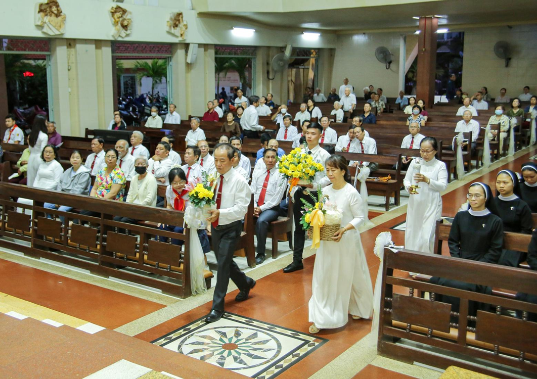 Hiệp dâng Thánh lễ có các nữ tu, thành viên Hội đồng mục vụ giáo xứ, đại diện các hội đoàn và đông đảo giáo dân. Thánh lễ khởi sự bằng đoàn rước từ cánh phải nhà thờ tiến vào cung thánh.