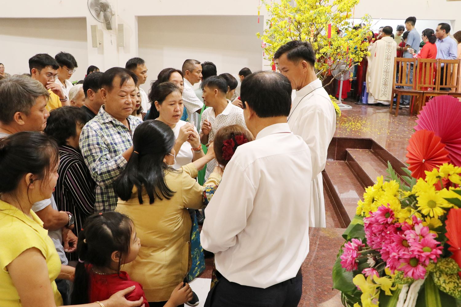 Trước khi ra về, trong bầu khí lắng đọng của đêm Giao thừa, cha Đa Minh cùng cộng đoàn sốt sắng dâng lên Mẹ chuỗi Mân Côi Năm sự Vui. Từng lời kinh Kính Mừng vang lên nhịp nhàng giữa thinh lặng thánh thiêng, như nhịp đập hiệp nhất của đại gia đình giáo xứ trong giờ phút chuyển giao năm mới.
