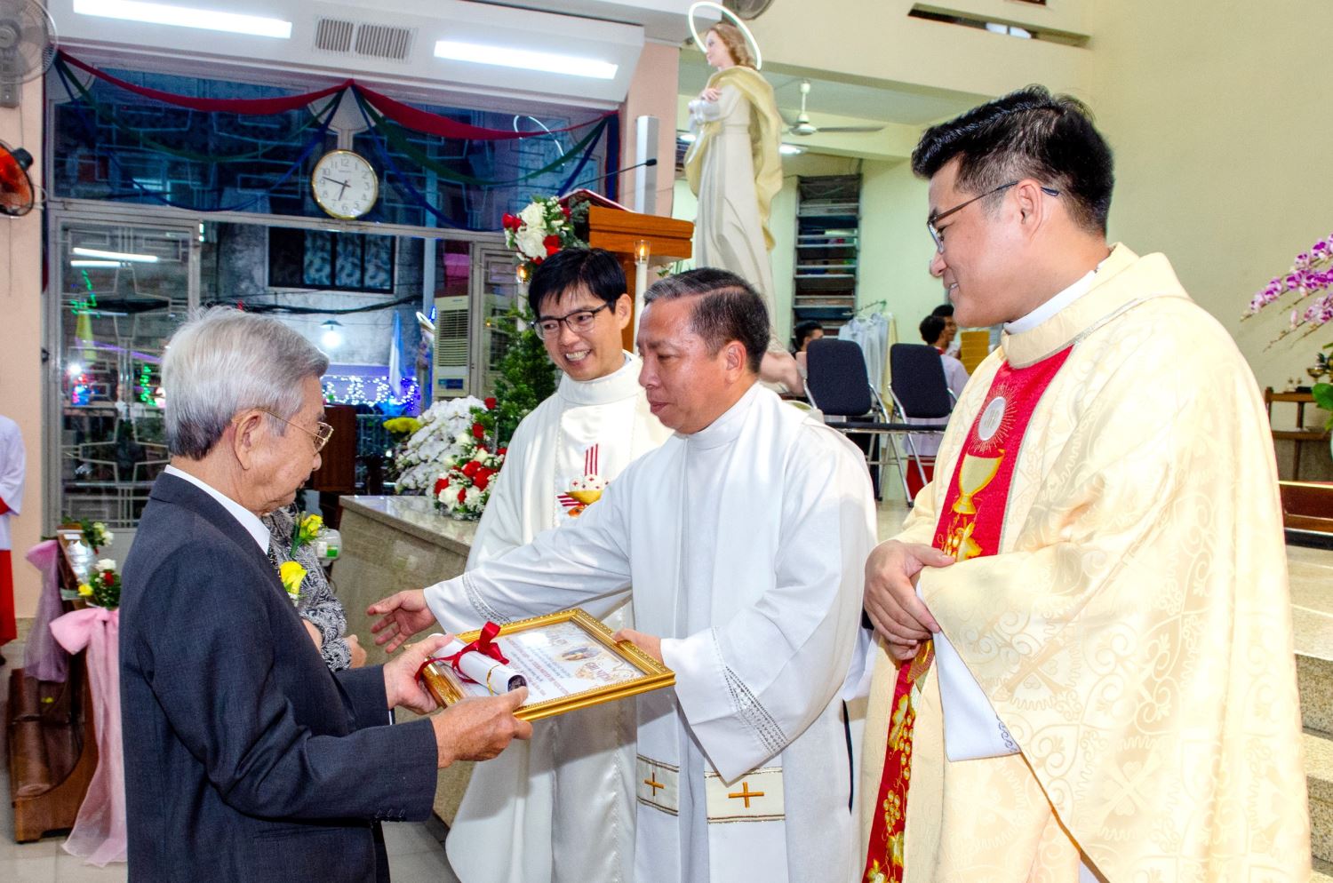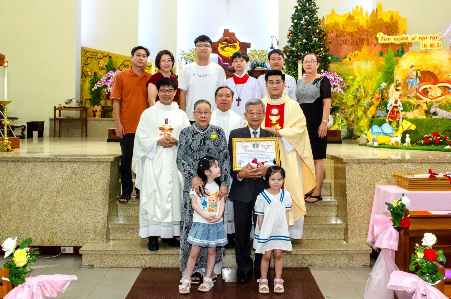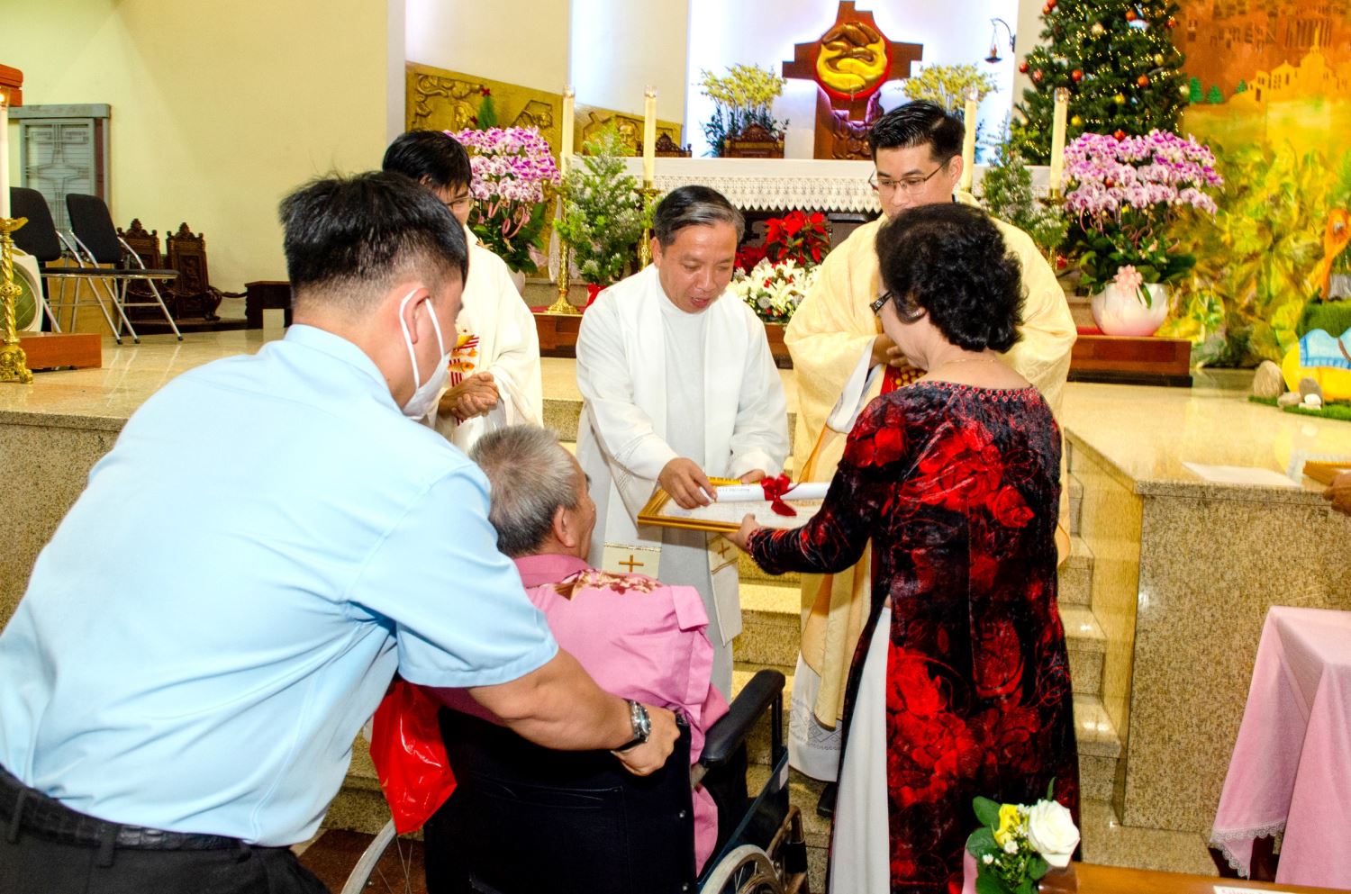 Sau lời nguyện hiệp lễ, linh mục chánh xứ Gioan Baotixita Nguyễn Quang Tuyến đã có lời chúc mừng và cầu chúc hồng ân Thiên Chúa cho các đôi hôn phối mừng kỷ niệm trong Thánh lễ hôm nay. Tiếp đó, ngài trao Bằng Phép lành Tòa Thánh cho 25 đôi hôn phối.