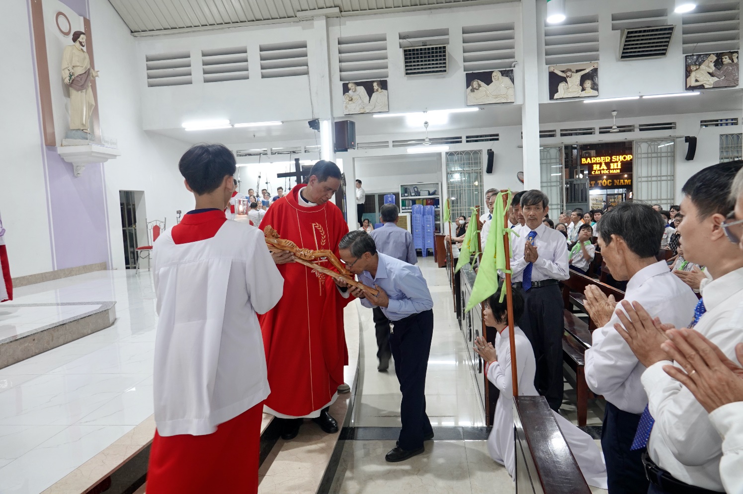 Trong nghi thức suy tôn và kính thờ Thánh giá, Lm chủ sự nâng Thánh giá lên ba lần để cộng đoàn tôn kính, cúi đầu thờ lạy và hôn kính. Lm chủ sự và các linh mục trong giáo xứ, các tông đồ, các sơ, đại diện Hội đồng mục vụ, đại diện các đoàn thể … lần lượt lên hôn kính Thánh giá Chúa.