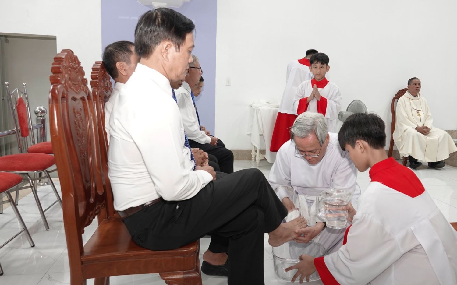 Sau phần chia sẻ Tin Mừng, Lm Chánh xứ đã chủ sự nghi thức rửa chân cho 12 “tông đồ”.