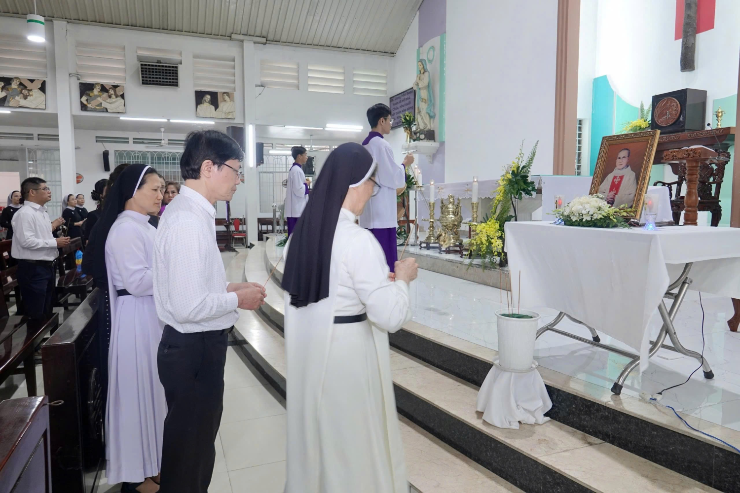 Sau đó, đoàn rước tay cầm nén hương kính tiến lên trước di ảnh Cha Cố, biểu lộ lòng kính nhớ và biết ơn đối với một mục tử đã sống trọn vẹn ơn gọi linh mục trong khiêm nhu và trung tín. Hương trầm nghi ngút, ánh nến lung linh như nhắc nhớ cộng đoàn về một đời hiến dâng đẹp như của lễ kính dâng lên Thiên Chúa.