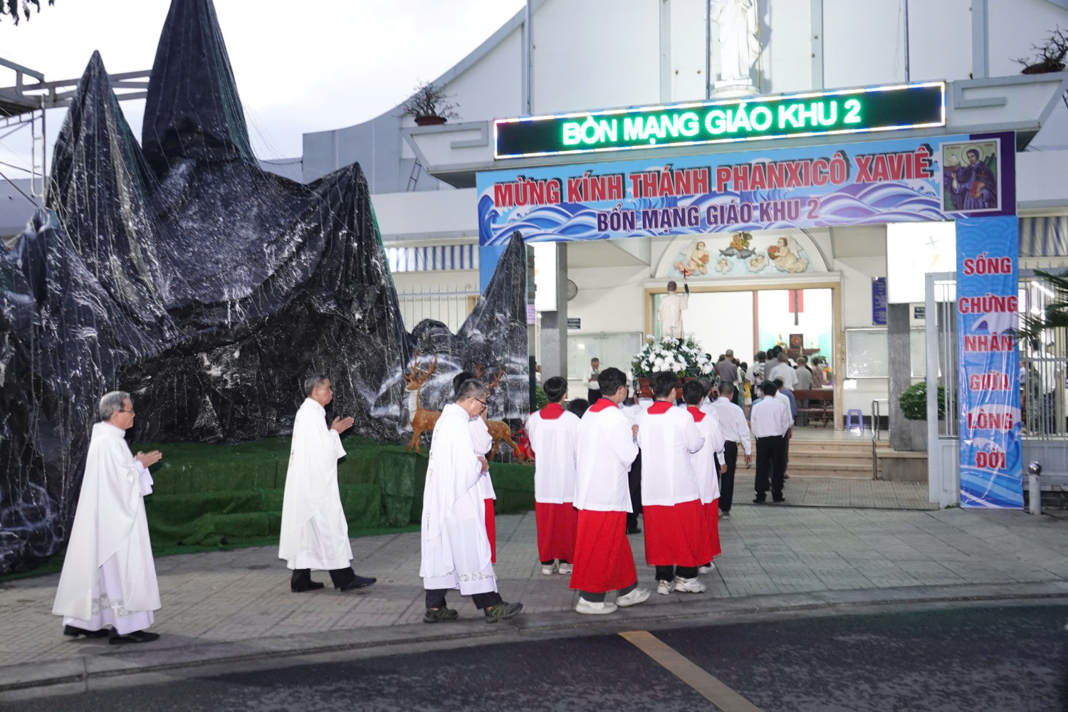 Thánh lễ khởi sự với đoàn rước kiệu Thánh Phanxicô Xaviê từ sân nhà thờ tiến vào cung thánh trong bầu khí trang nghiêm và sốt sắng.