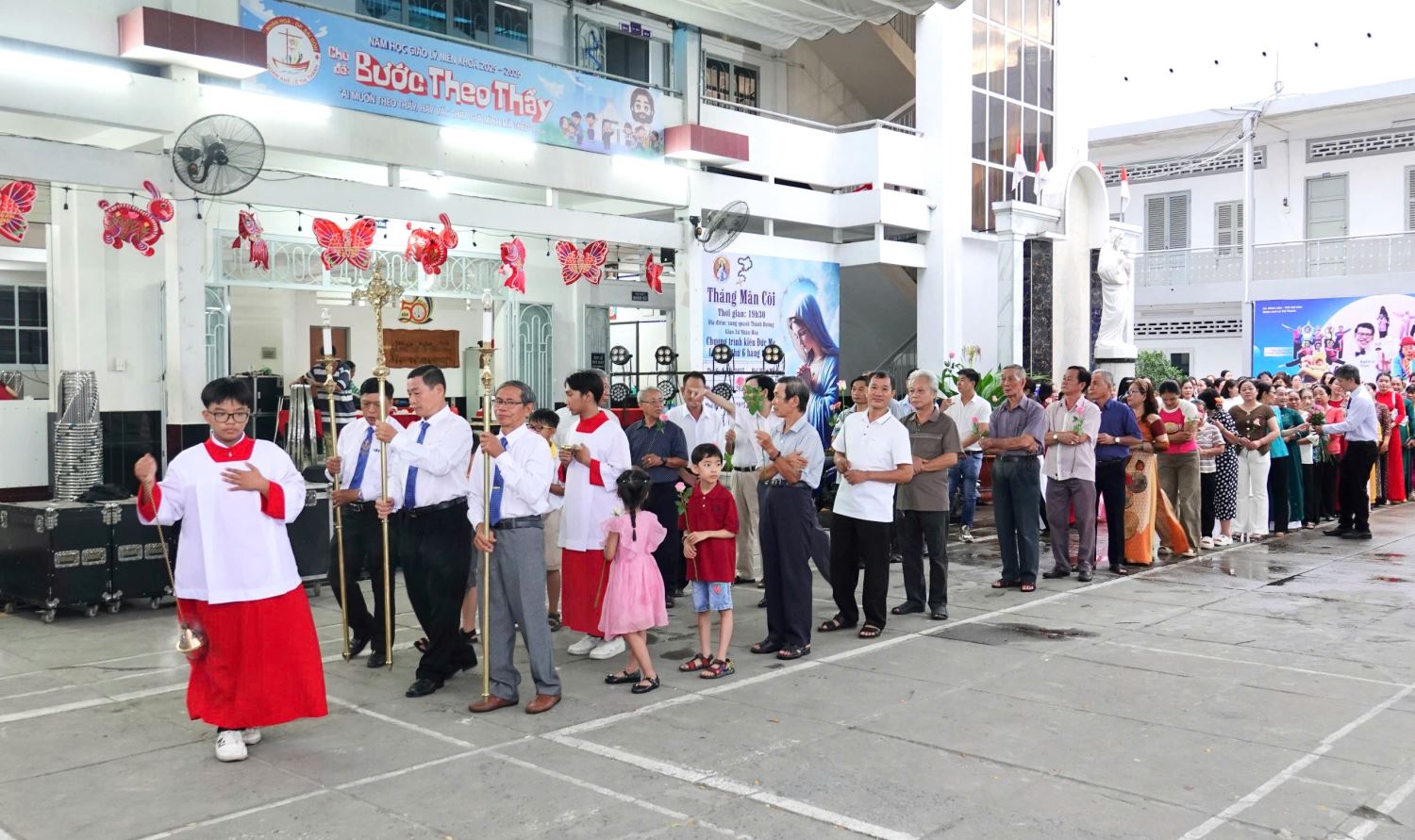 Thánh lễ được mở đầu với đoàn rước kiệu Thánh Têrêsa từ sân nhà thờ tiến vào cung thánh trong bầu khí trang nghiêm và sốt sắng.