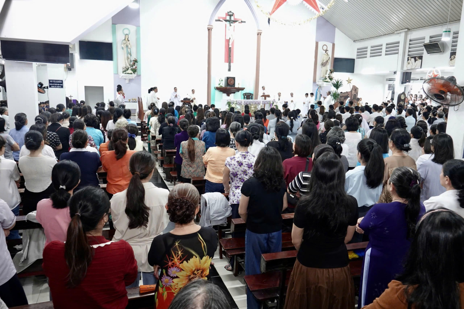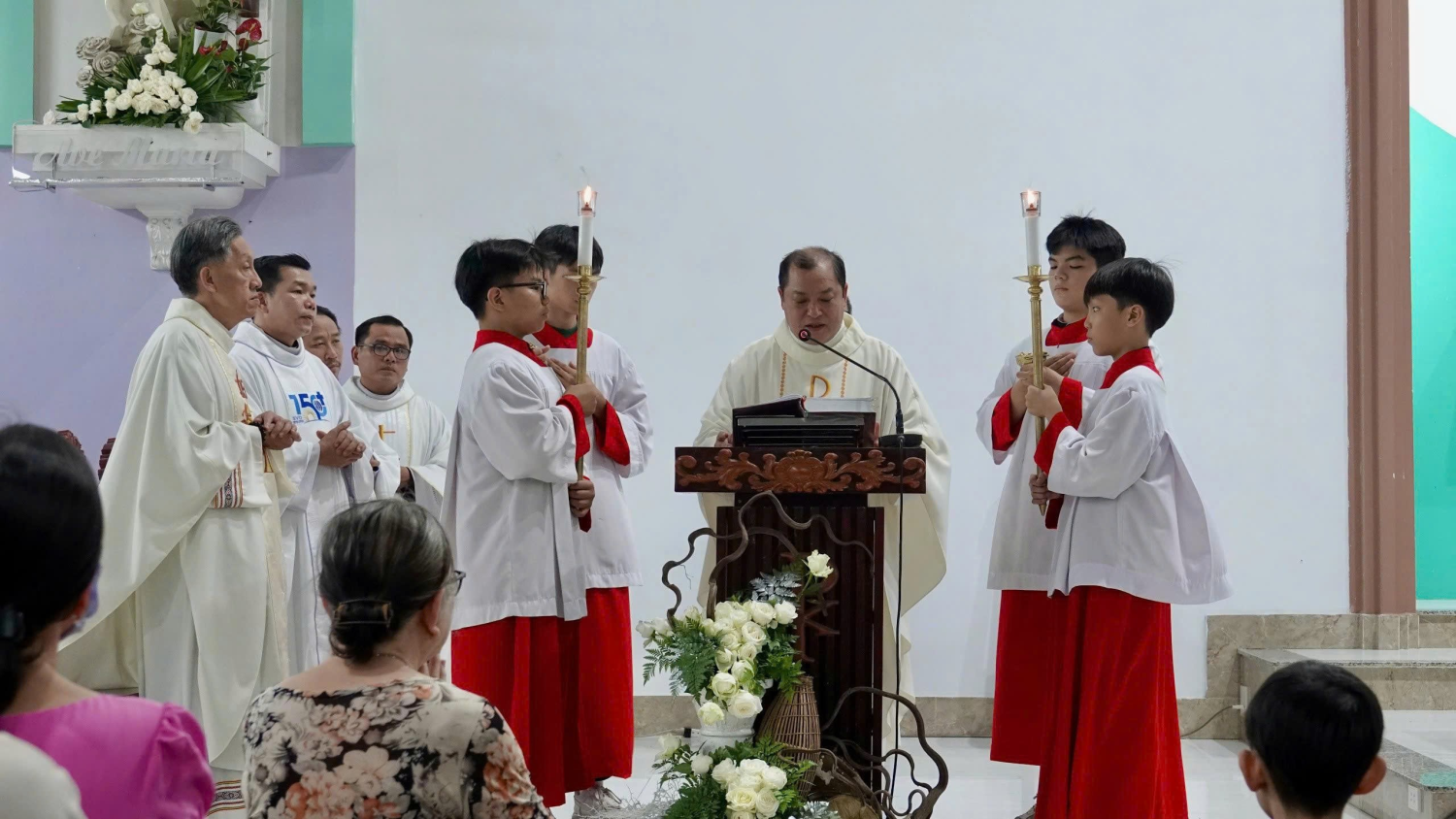 Thánh lễ do linh mục chánh xứ Giuse Hồ Thứ chủ tế, đồng tế với hai linh mục phó xứ Gioakim Đỗ Bá Thái và Giuse Nguyễn Thành Công - Đặc trách Giới trẻ, cùng 10 linh mục thuộc Cộng đoàn Dự tu.