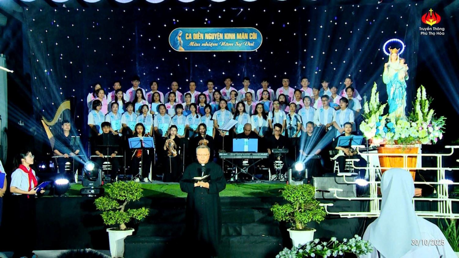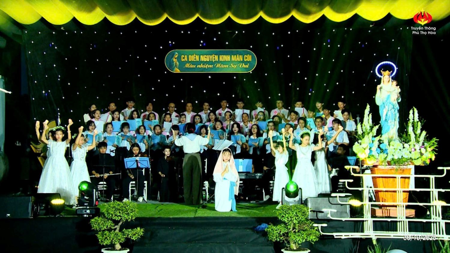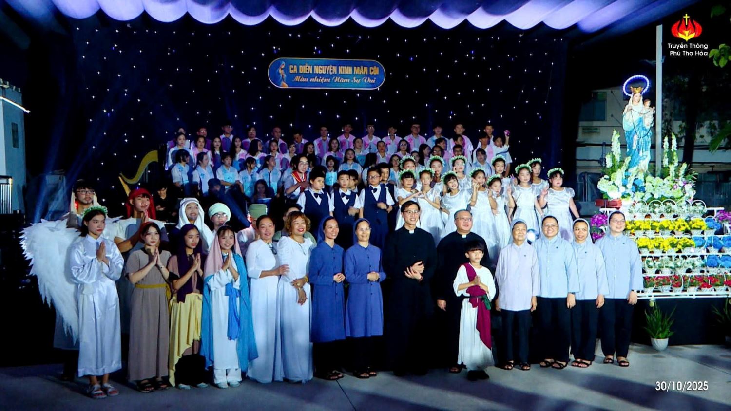 TGPSG -- Sau 4 tuần thực hiện đọc kinh Mân Côi kính Đức Mẹ vào thứ Bảy hàng tuần tại đài Đức Mẹ, lúc 19g đến 20g30 thứ Năm ngày 30-10-2025, kết thúc tháng Mân côi, Ban điều hành Giới trẻ và đoàn Thiếu nhi Thánh Thể của giáo xứ Phú Thọ Hòa đã kết hợp để tổ chức một buổi Diễn nguyện Thánh ca.