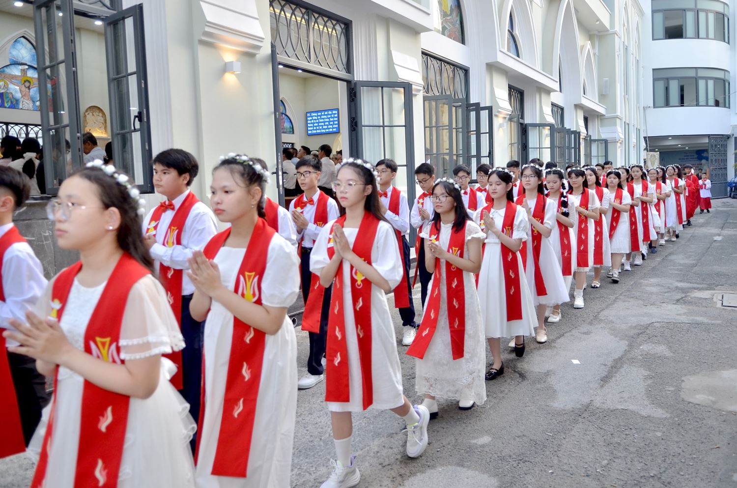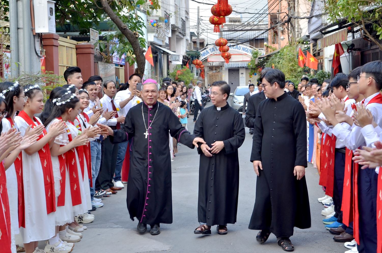 Trước Thánh lễ, các em thiếu nhi cùng Hội đồng Mục vụ giáo xứ đã xếp thành hai hàng trang trọng chào đón Đức Giám mục Phụ tá Giuse đến thăm mục vụ và ban Bí tích Thêm Sức, trong sự tiếp đón của cha chánh xứ và cha phó xứ.
