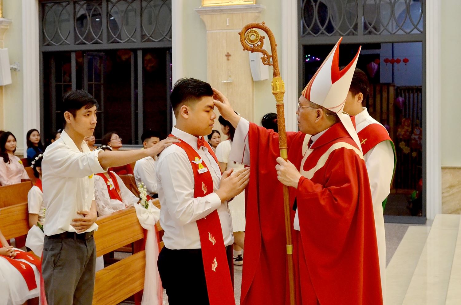 Sau bài giảng, Đức Giám mục Phụ tá Giuse đã cử hành nghi thức ban Bí tích Thêm Sức cho các em theo truyền thống của Hội Thánh: lặp lại lời tuyên xưng đức tin khi lãnh nhận Bí tích Thánh Tẩy, đặt tay cầu xin ơn Chúa Thánh Thần và xức dầu thánh trên trán. Lần lượt từng em thiếu nhi, cùng người đỡ đầu, tiến lên lãnh nhận ấn tín Chúa Thánh Thần.