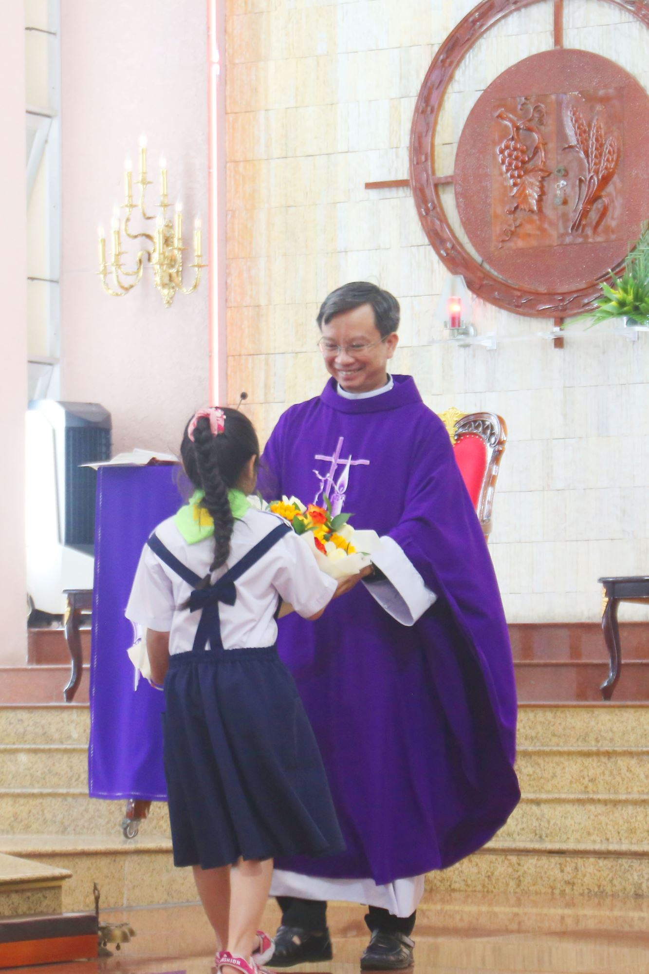 Một em thiếu nhi đại diện trao tặng linh mục bó hoa tươi thắm, thể hiện tình cảm và lòng tri ân của toàn thể đoàn.