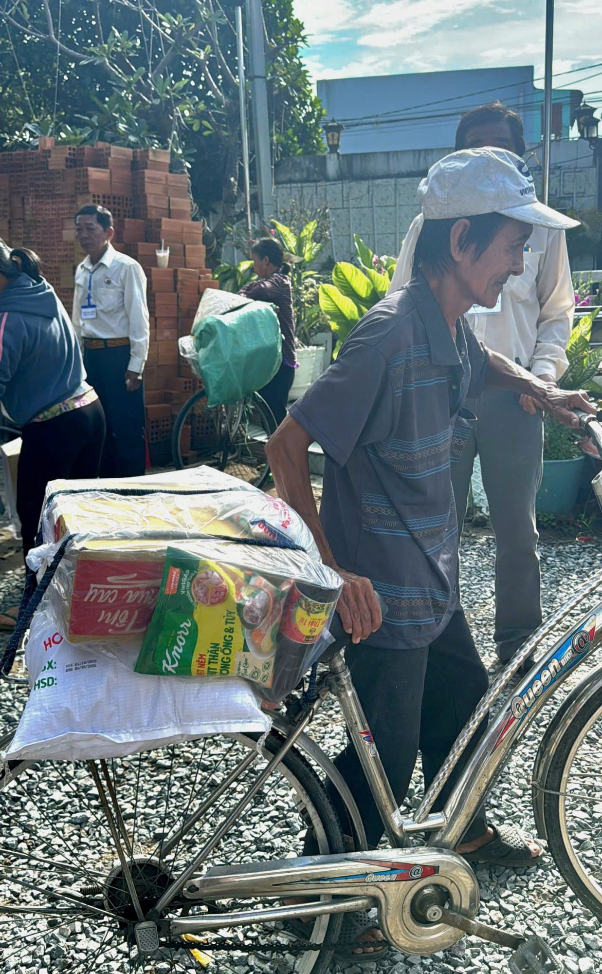 Một cụ ông đội mũ lưỡi trai trắng, dáng người gầy gò nhưng đôi mắt hiền từ, chậm rãi dắt chiếc xe đạp cũ với phần quà buộc gọn phía sau.