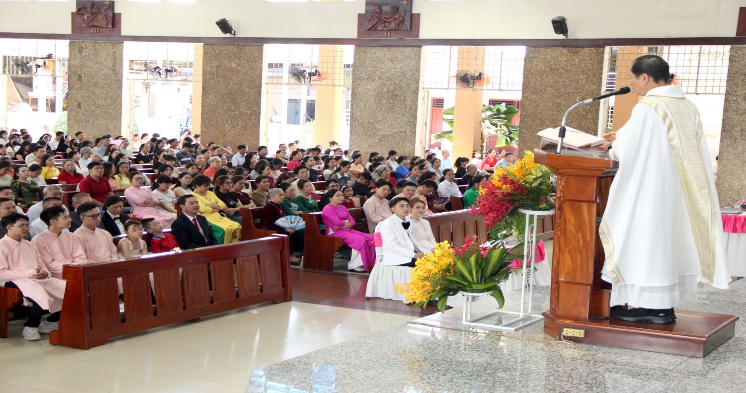 Đối với đôi bạn trẻ chuẩn bị cử hành Bí tích Hôn phối, linh mục chủ tế chia sẻ: Thiên Chúa là tình yêu; yêu là cho đi, yêu là hy sinh, yêu là nên một với nhau để gia đình trở thành một gia đình truyền giáo, để người khác nhận biết Chúa qua tình yêu của hai anh chị. Chúng ta tiếp tục cầu nguyện để mọi người nhận ra tình yêu thương của Chúa, và mỗi người Kitô hữu hãy trở thành khí cụ loan báo tình yêu thương và ơn cứu độ cho mọi người.”