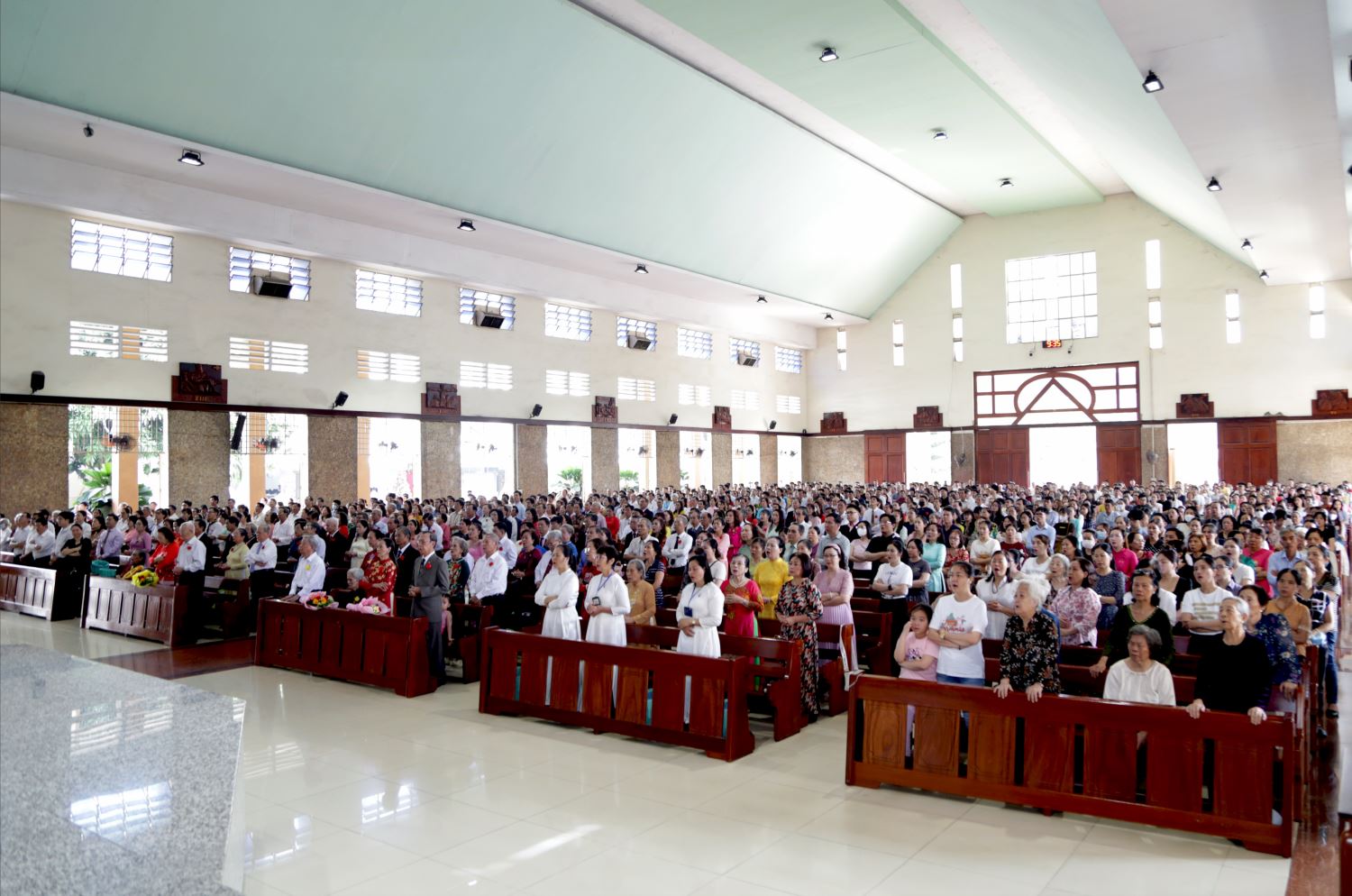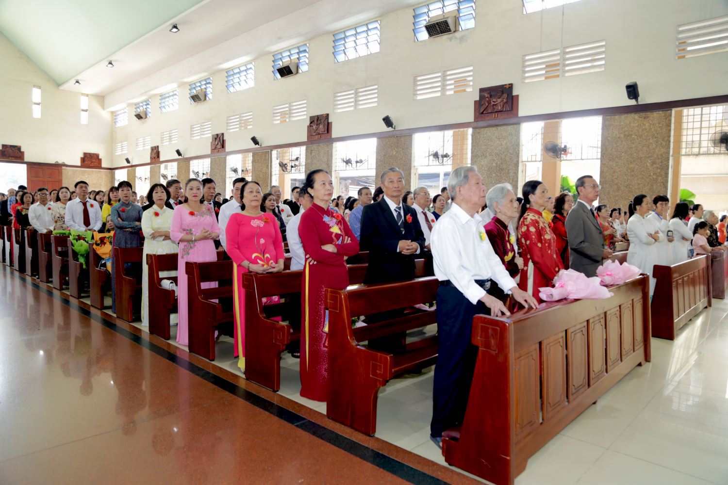 Từ lúc 9 giờ, các chị trong Hội Các Bà Mẹ Công giáo chào đón các đôi Hôn phối với những nụ hoa hồng cài trên áo cho các ông, đồng thời trao tặng bó hoa tươi thắm cho các bà. Lúc này, nhiều đôi Hôn phối đã có mặt tại nhà thờ. Một số cụ cao niên được con cháu dìu đi do sức khỏe hạn chế, nhưng trong lòng các cụ rất háo hức tạ ơn Chúa trong Lễ kỷ niệm đặc biệt này.