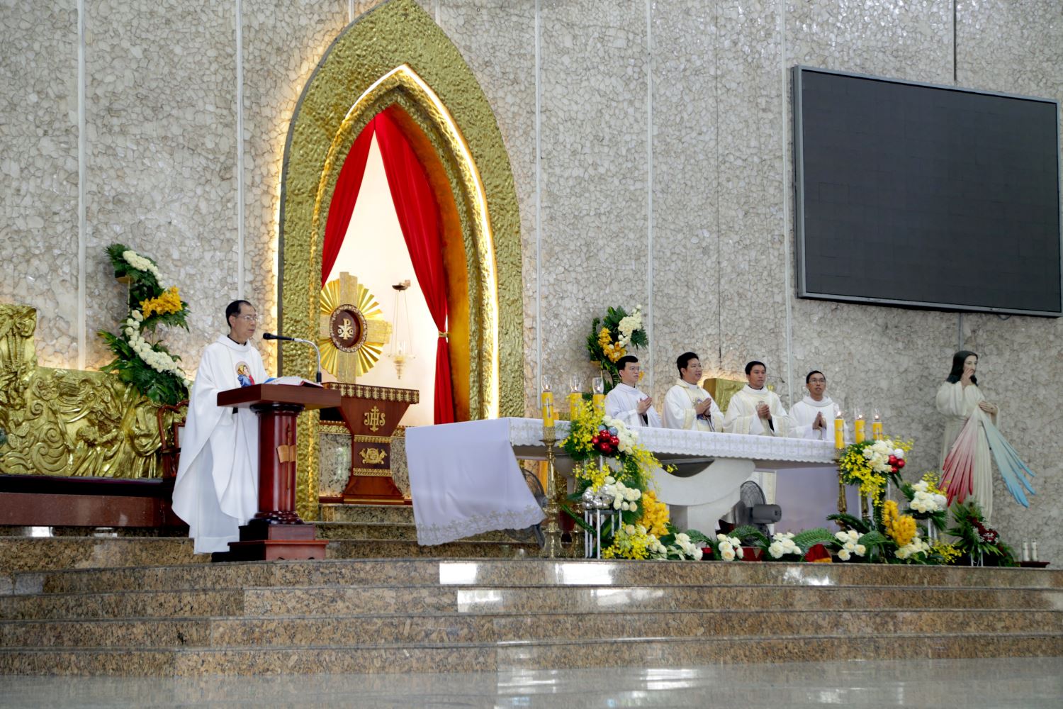 Lúc 9 giờ 30, các đôi Hôn phối đã rước đoàn đồng tế từ sảnh nhà thờ tiến lên cung thánh. Thánh lễ do linh mục Giuse Lê Hoàng chủ tế, đồng tế với ngài có các linh mục phó xứ: Gioan Lasan Đặng Thiên Quang, Giuse Vũ Hoàng Thanh, cùng các linh mục con của giáo xứ: Phêrô Mai Phi Hổ, Giuse Nguyễn Duy Hoàng, và linh mục Khoa (OP).