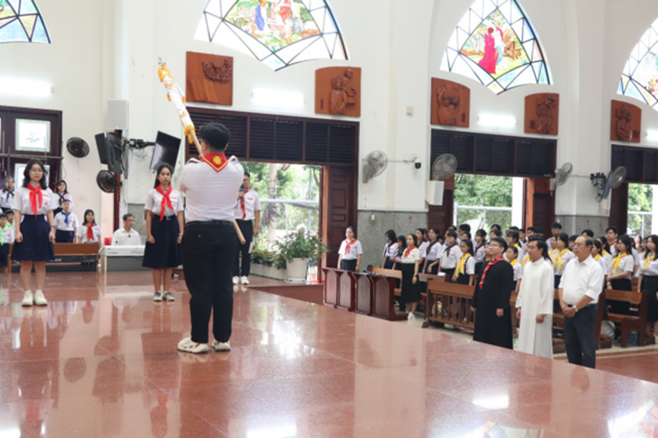 Mở đầu Thánh lễ, Lm Chủ tế mời gọi cộng đoàn hiệp ý cầu nguyện cho các em ngành Thiếu nhi và Nghĩa sĩ tuyên hứa, nhận khăn, cùng cầu nguyện cho quý ân nhân trong việc đóng góp, tổ chức Lễ hội “Vui Trung Thu cùng Mẹ Maria”.