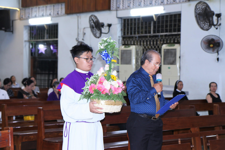 Thánh lễ tiếp tục. Sau lời nguyện hiệp lễ, ông Chủ tịch HĐMVGX đại diện cộng đoàn có tâm tình cảm mến tri ân cha xứ Ignatio và Lm Giuse đã giảng tĩnh tâm, giúp cộng đoàn thay đổi tâm hồn và cách sống đẹp lòng Chúa. Nhân lễ Thánh Giuse bổn mạng, cộng đoàn tặng hoa và chúc Lm Giuse luôn mạnh khỏe, đầy ơn Chúa Thánh Thần để chu toàn sứ vụ Chúa trao.
