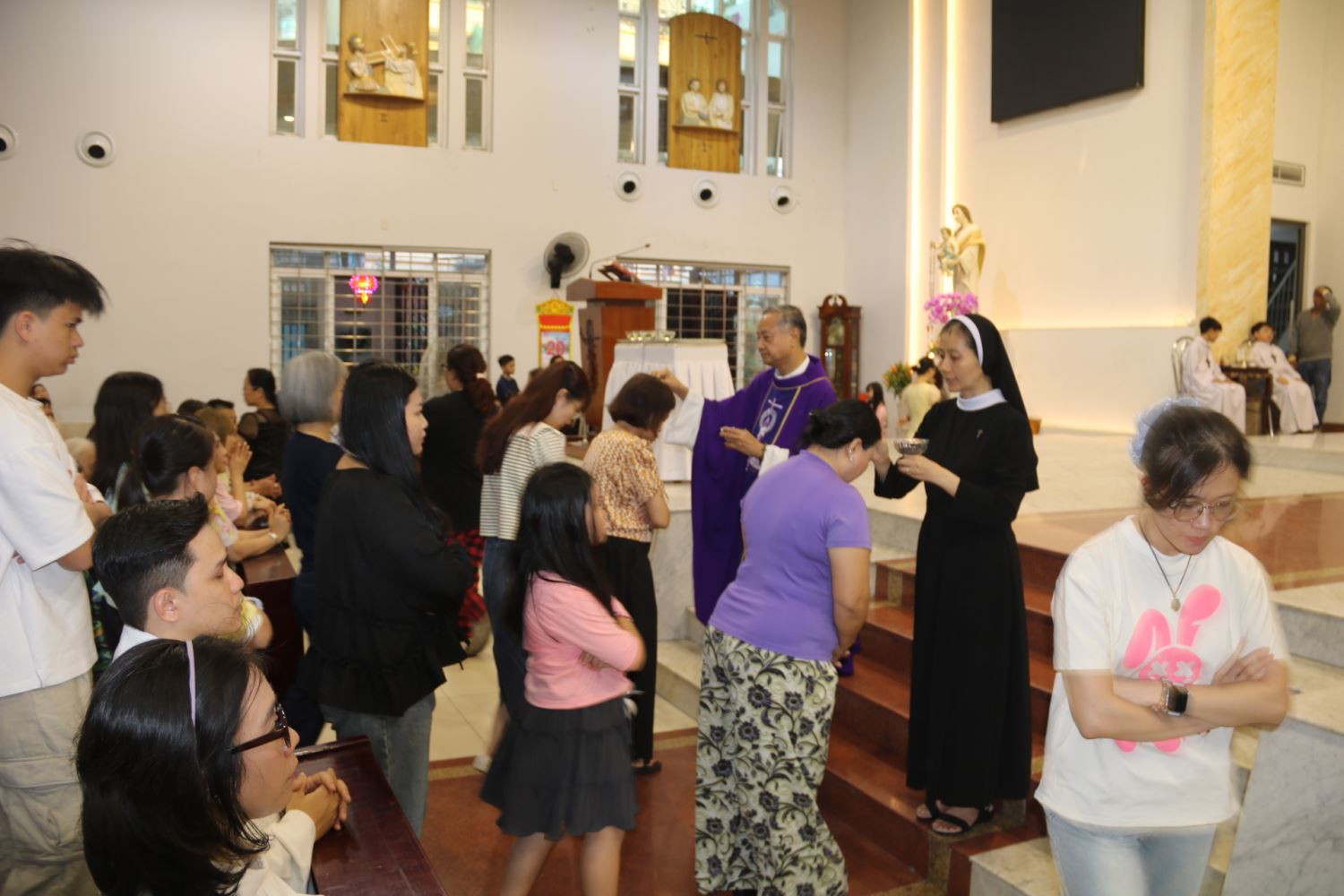 Sau bài giảng, cộng đoàn lần lượt tiến lên lãnh nhận tro. Từ các em thiếu nhi đến những người lớn tuổi, mọi người đều cúi đầu đón nhận dấu tro như một lời nhắc nhở bước vào Mùa Chay với quyết tâm đổi mới đời sống.