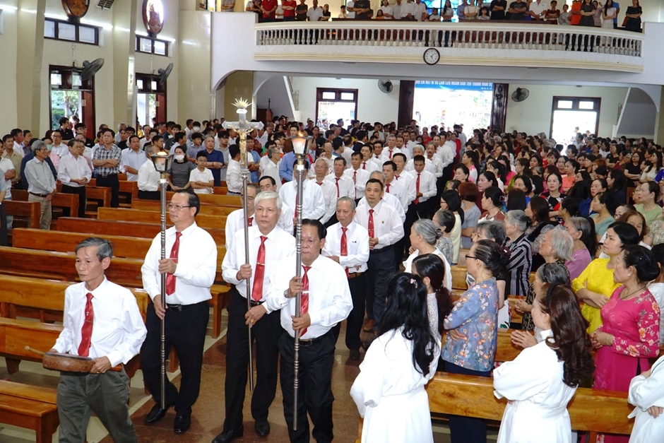 Thánh lễ khởi sự với đoàn rước từ Nhà Chầu Thánh Thể tiến lên cung thánh.
